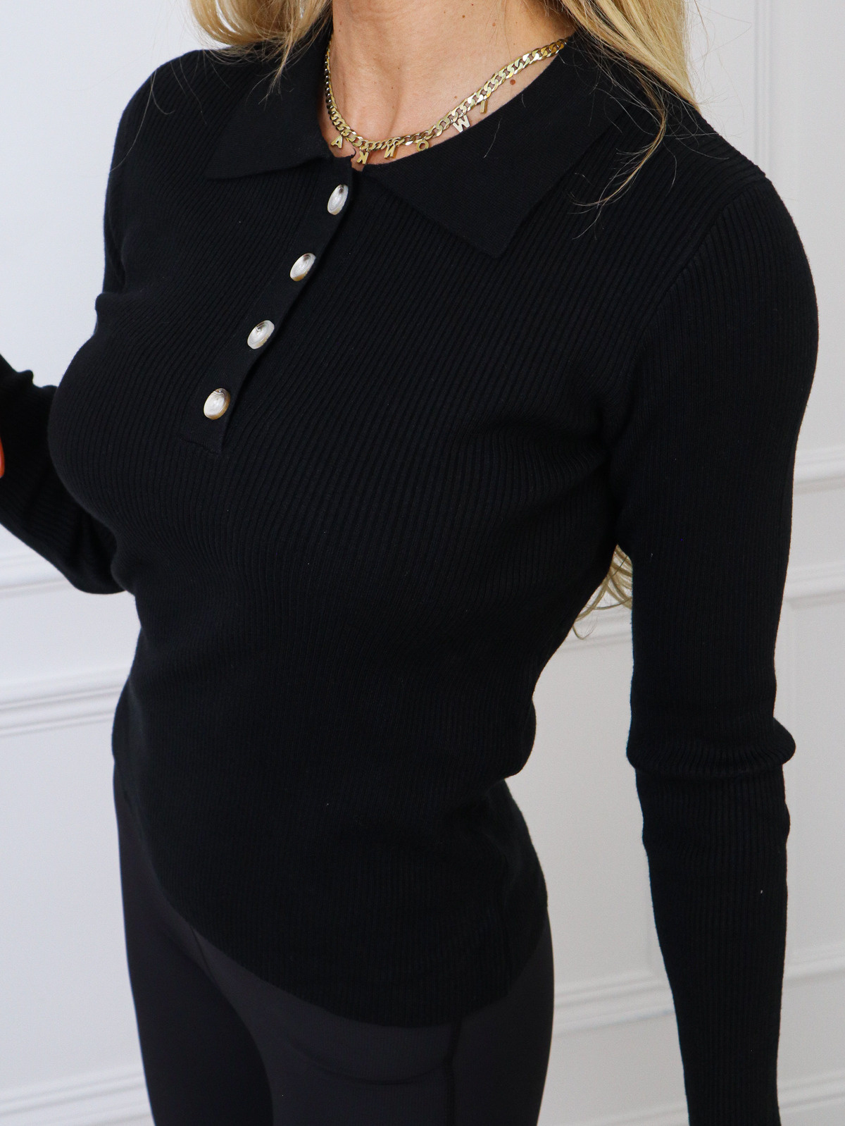 DZIANINOWA BLUZKA SWETEREK Z KOŁNIERZYKIEM I GUZIKAMI- CZARNA