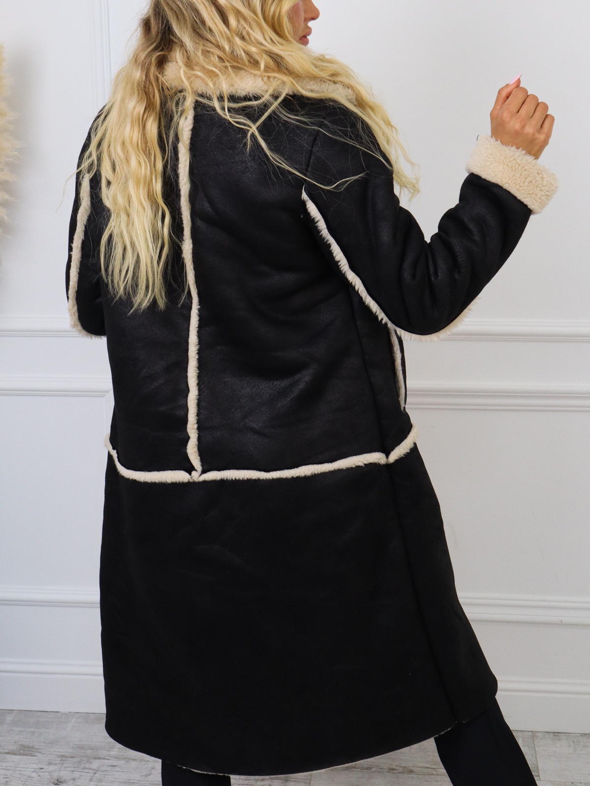 Płaszcz o kroju midi z modnymi szwami i obszyciami z kożuszka. Posiada przyjemną w dotyku podszewkę. Model posiada z przodu kieszenie, kołnierz obszyty kożuszkiem, tak samo jak zakończenia rękawów..
