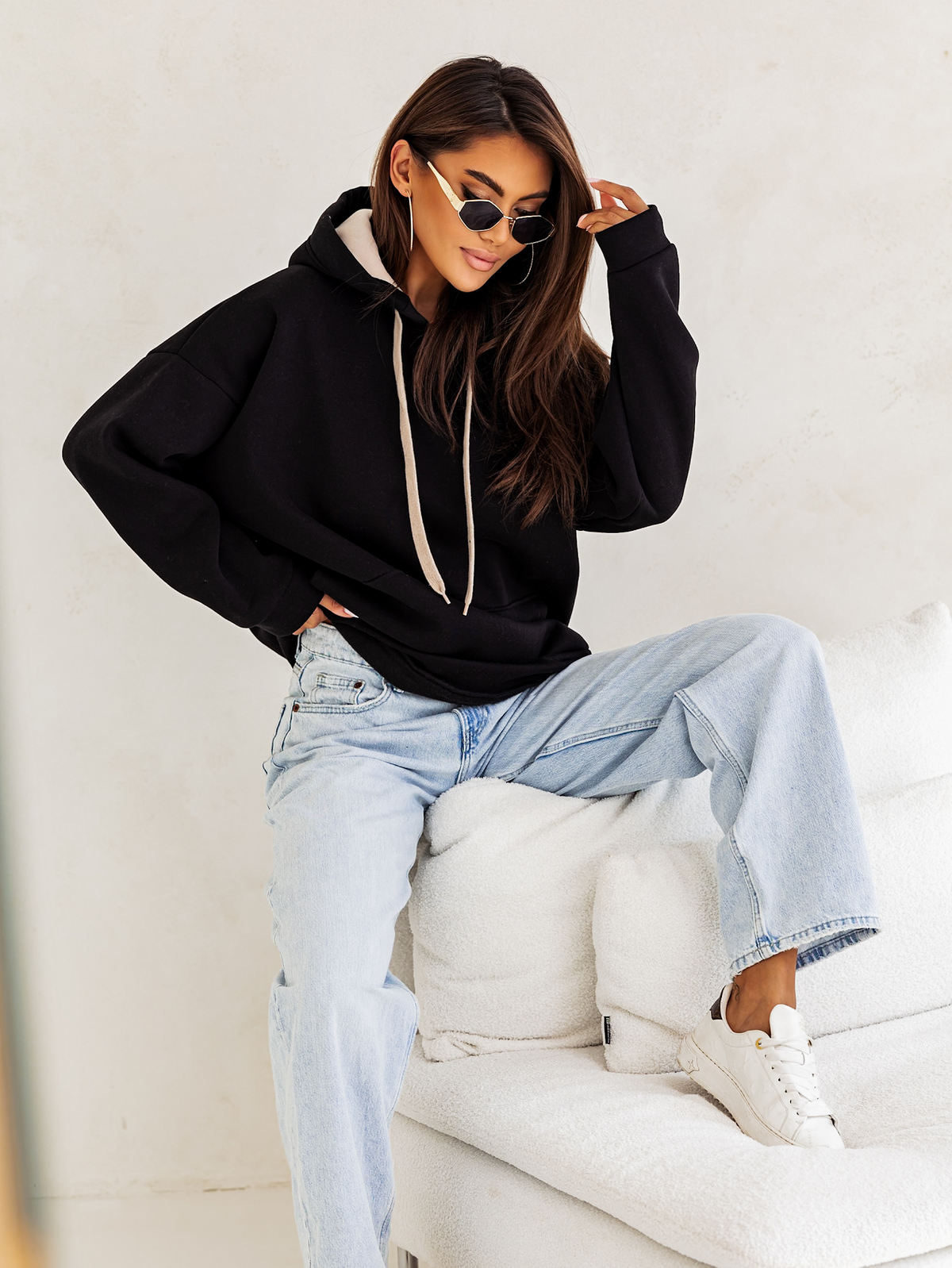 CIEPŁA BLUZA OVERSIZE Z KAPTUREM I ŚCIĄGACZEM-CZARNA