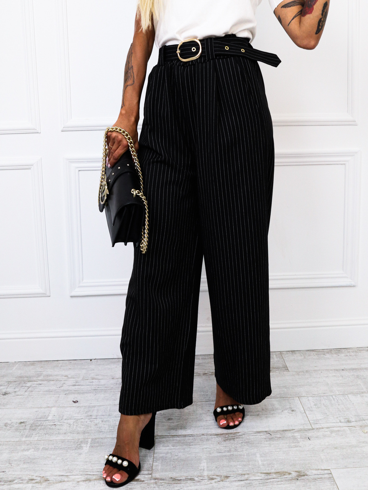 ELEGANCKIE SPODNIE W PASKI Z SZEROKĄ NOGAWKĄ+ PASEK- CZARNE