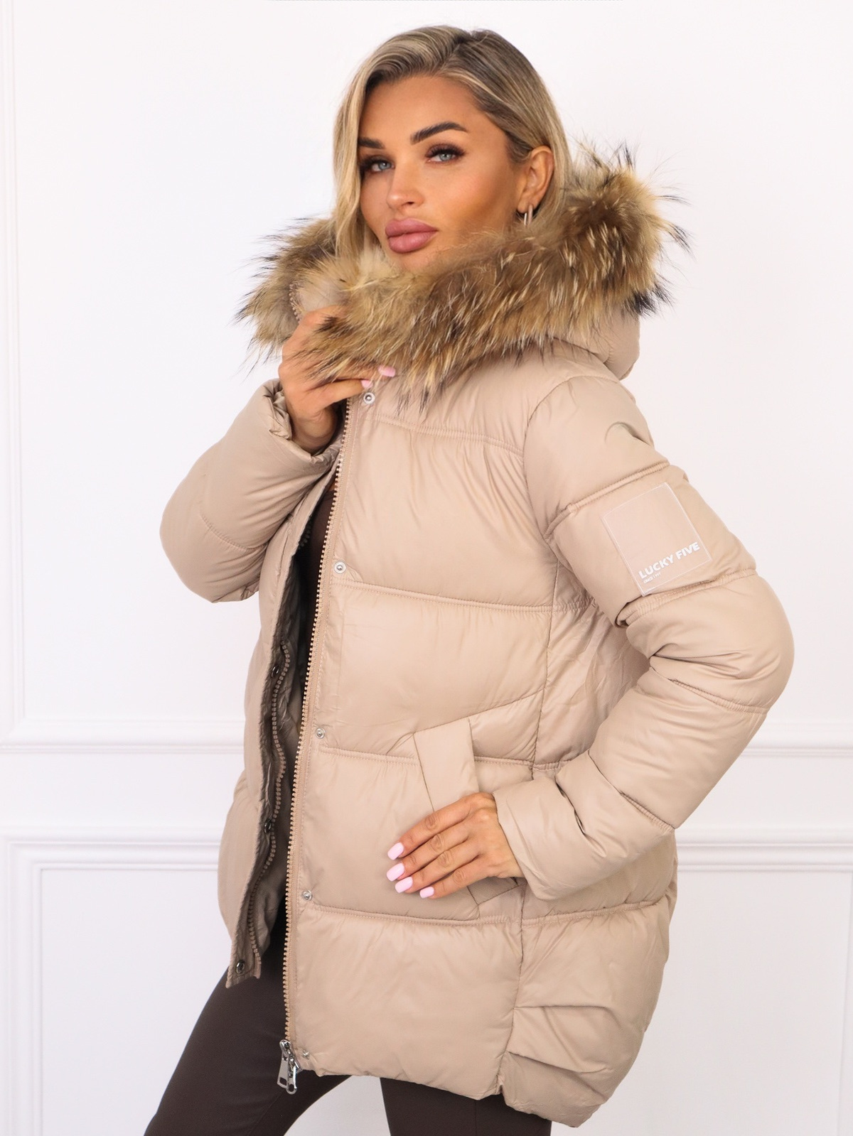 KURTKA ASYMETRYCZNA Z NASZYWKĄ NA RĘKAWIE I FUTERKIEM- BEŻOWA