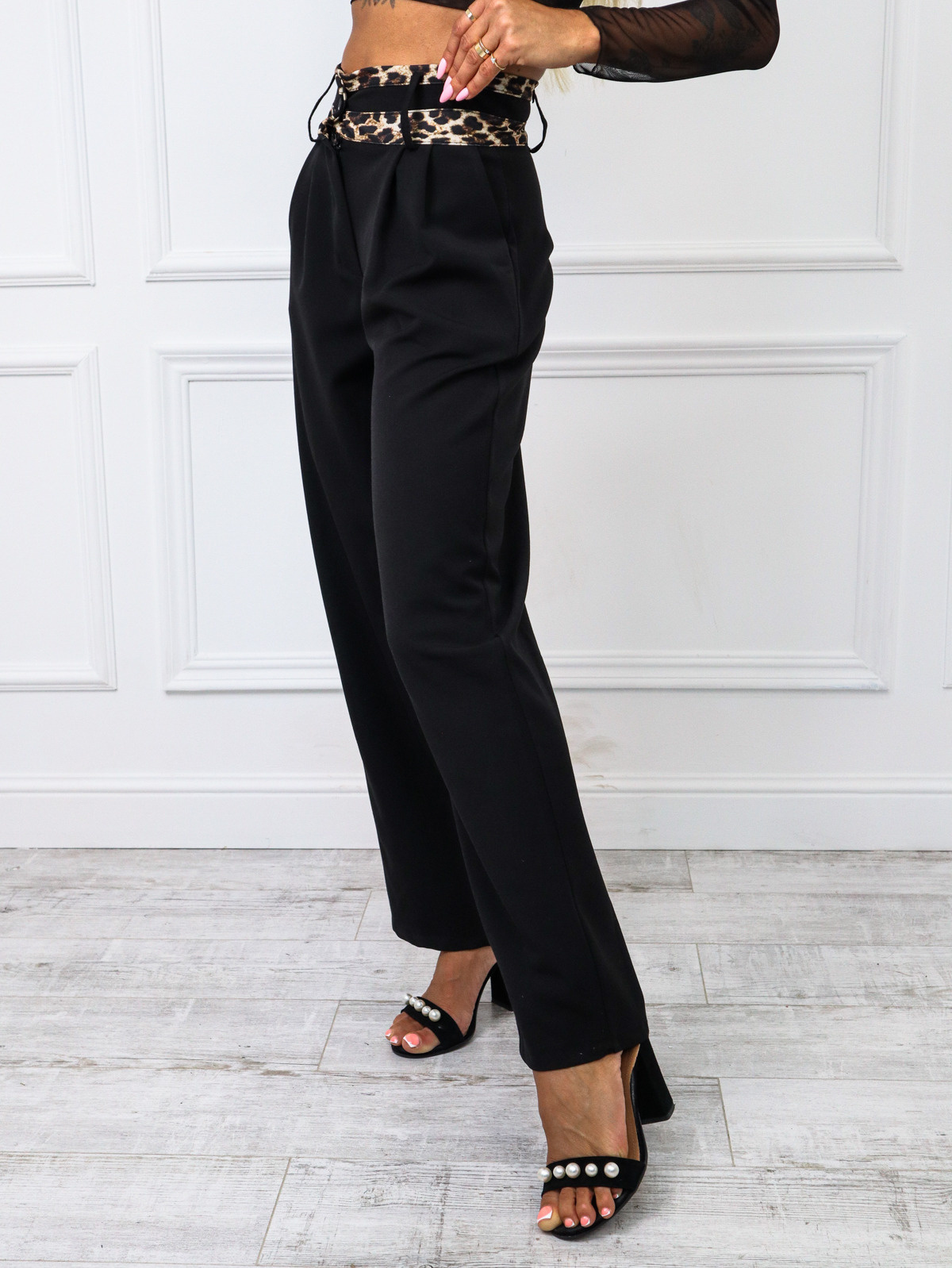 ELEGANCKIE SPODNIE Z OZDOBNĄ WSTAWKĄ W PASIE PANTERKA- CZARNE
