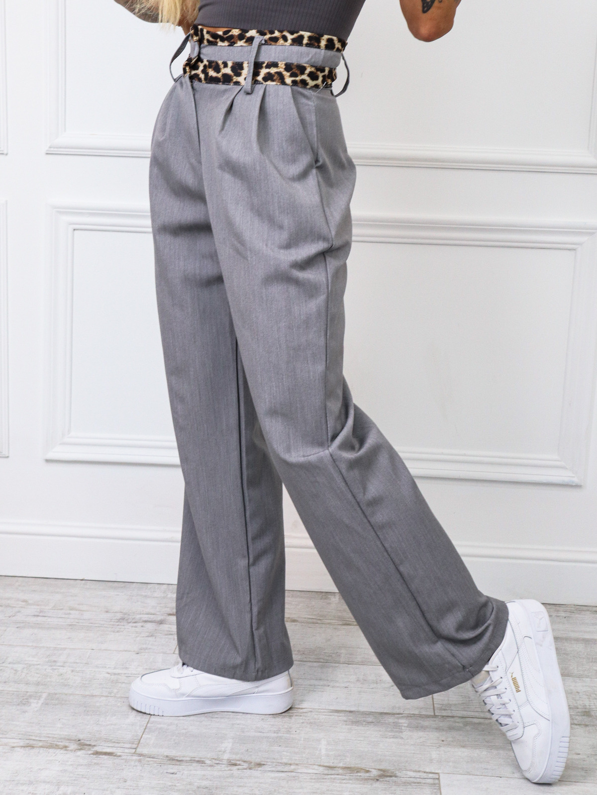 ELEGANCKIE SPODNIE Z OZDOBNĄ WSTAWKĄ W PASIE PANTERKA- SZARE