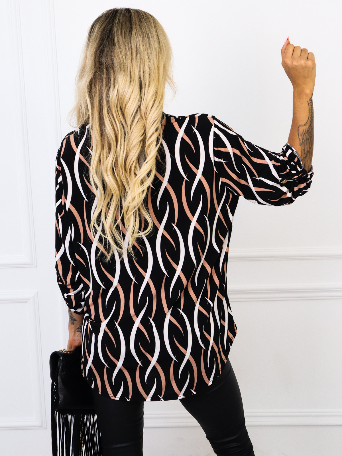 BLUZKA ONE SIZE WE WZORY DEKOLT W SEREK I RĘKAW 3/4 - CZARNA