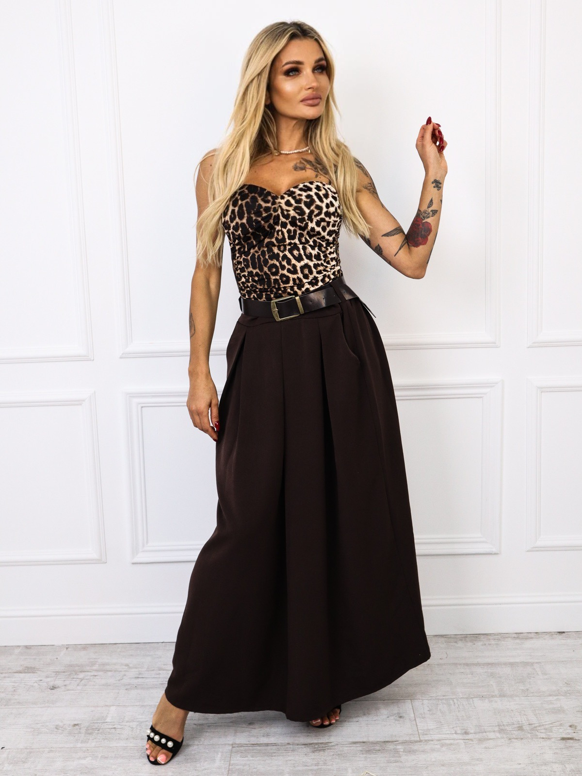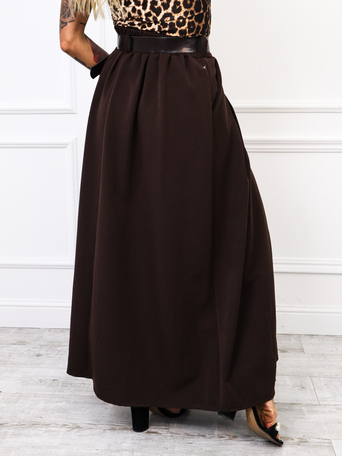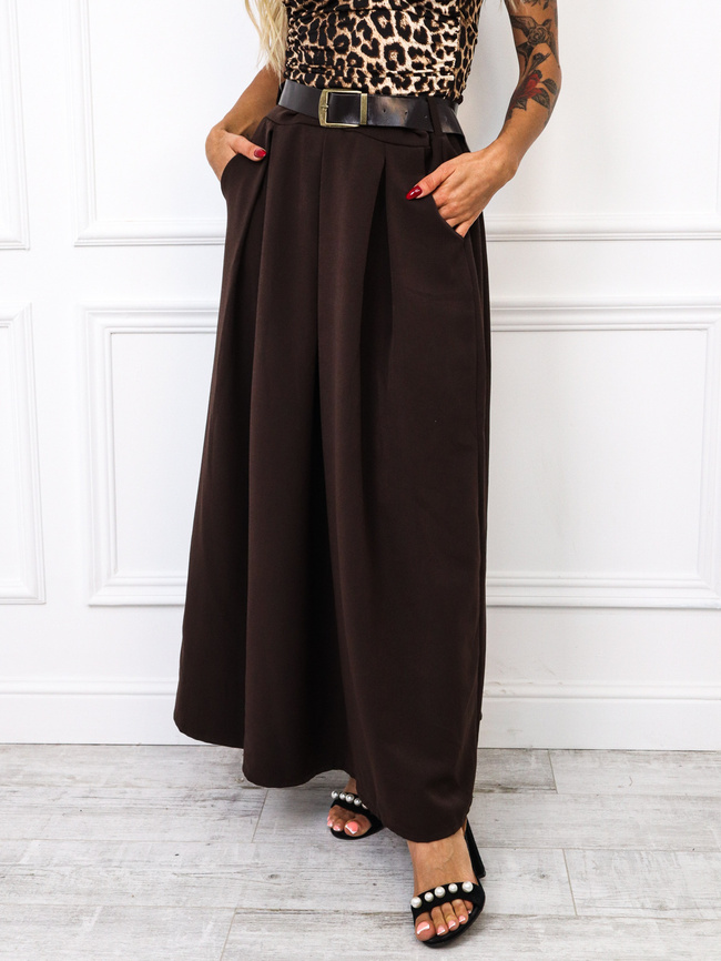 MATERIAŁOWA SPÓDNICA MIDI Z KIESZENIAMI+ PASEK- CIEMNO BRĄZOWA