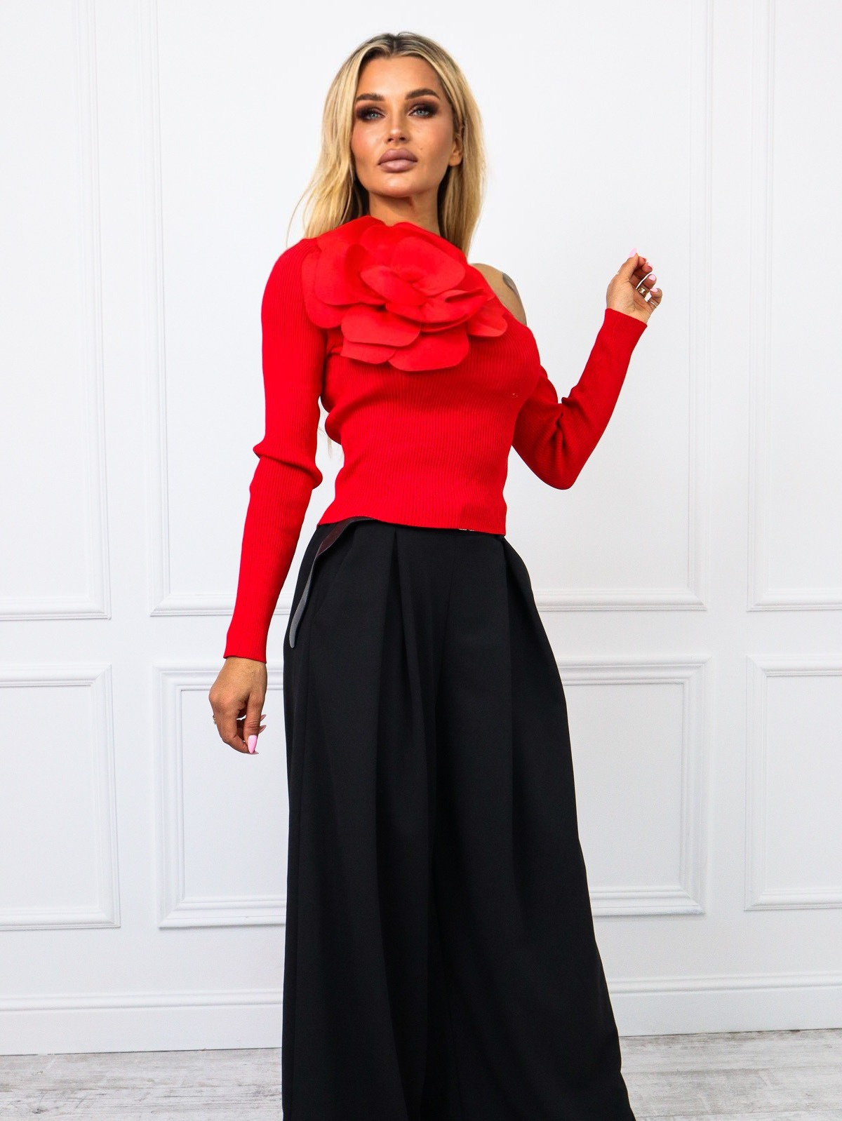 BLUZKA PRĄŻKOWANA NA JEDNO RAMIE Z DUŻYM KWIATEM- CZERWONA