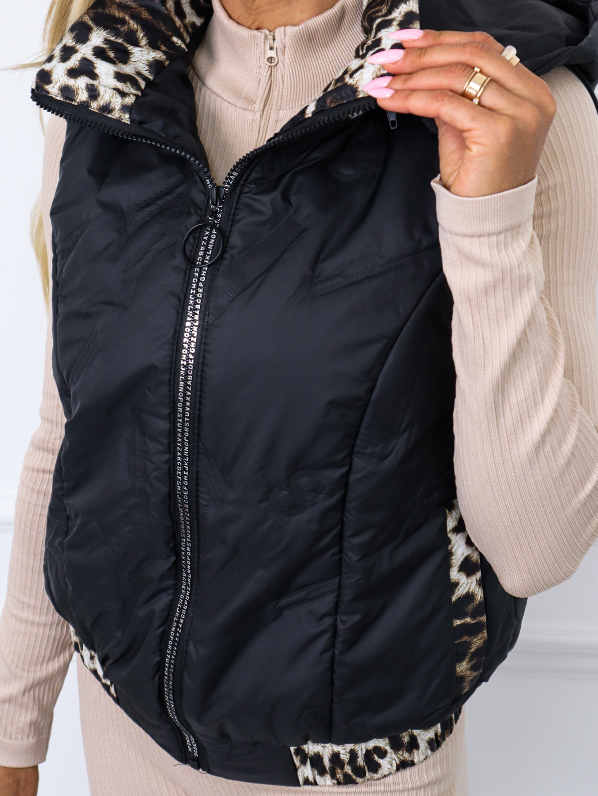 PIKOWANA KAMIZELKA Z KAPTUREM ZE WSTAWKAMI W PANTERKĘ- CZARNA