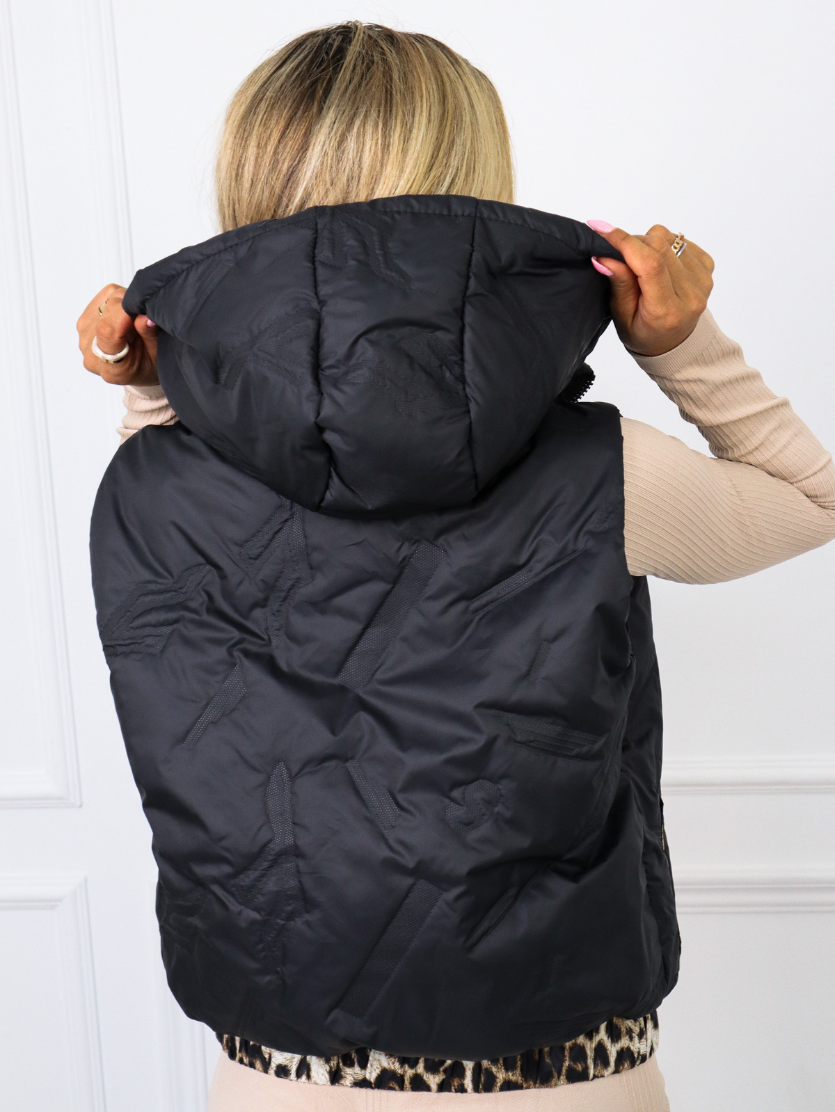 Kamizelka z kapturem, zapinana na złoty zamek. Kontrastowe wstawki w panterkę. Na dole ściągacz.