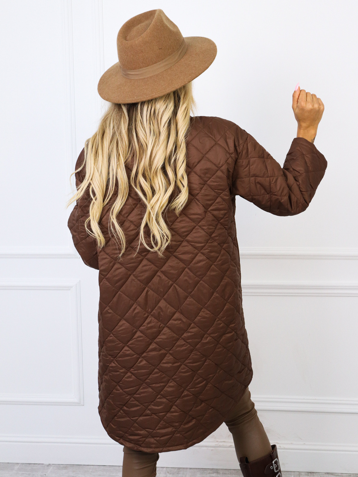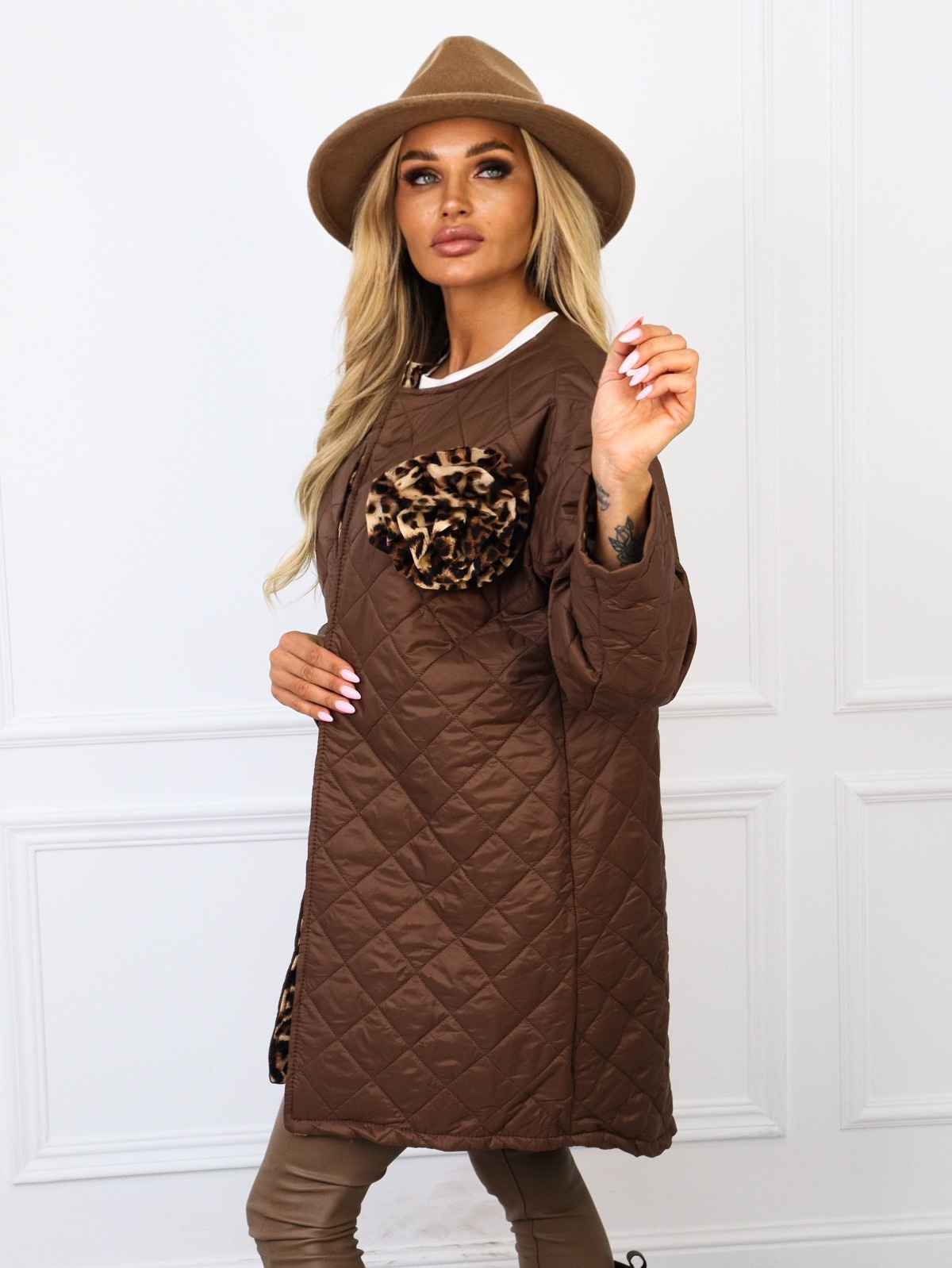 Długa, pikowana kurtka z panterkowym obszyciem od wewnątrz. Model z obniżoną linią ramion posiada ozdobną broszkę w kształcie róży.