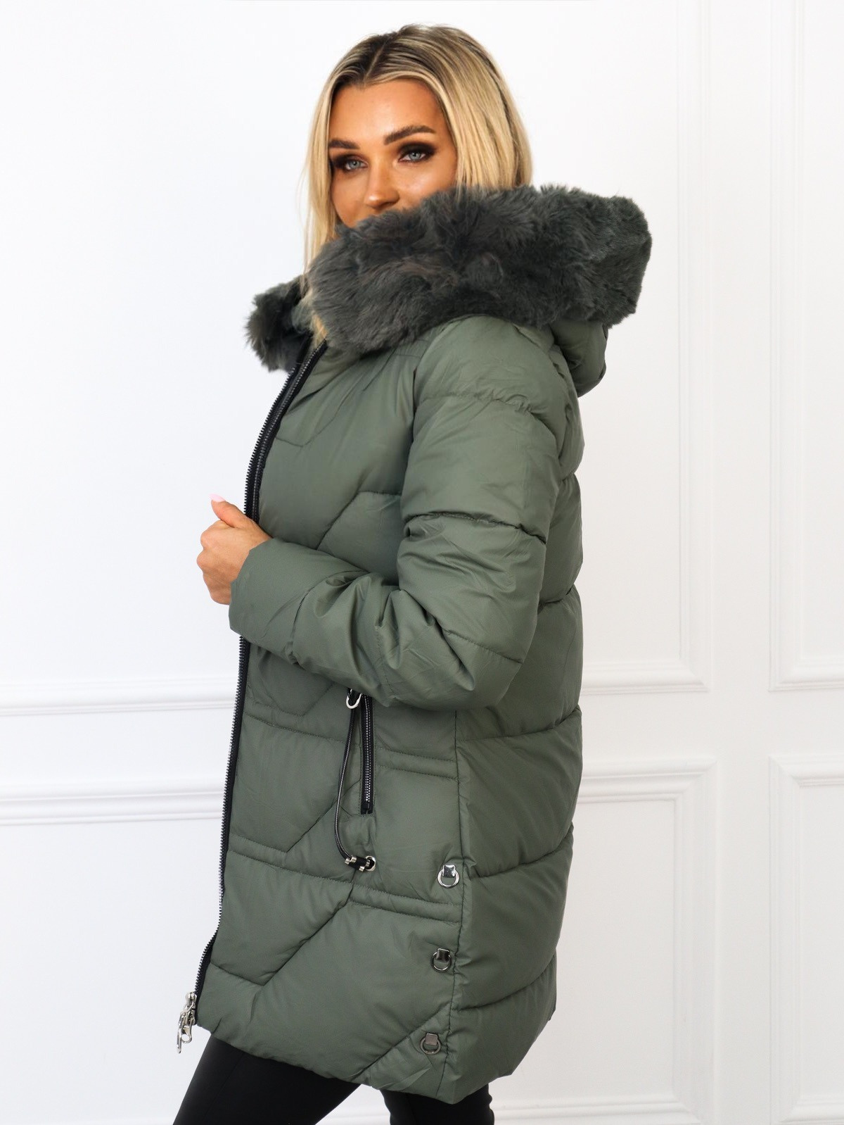 Długa pikowana kurtka, kieszenie zapinane na zamek, po bokach ozdobne elementy. Odpinane futerko przy kapturze.