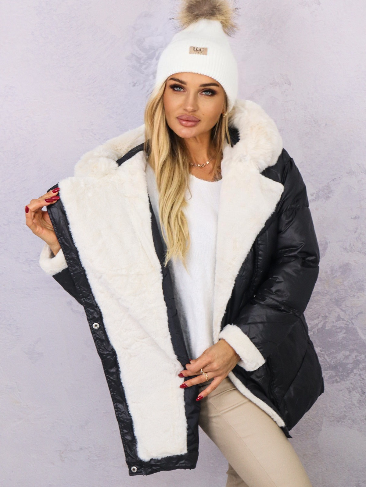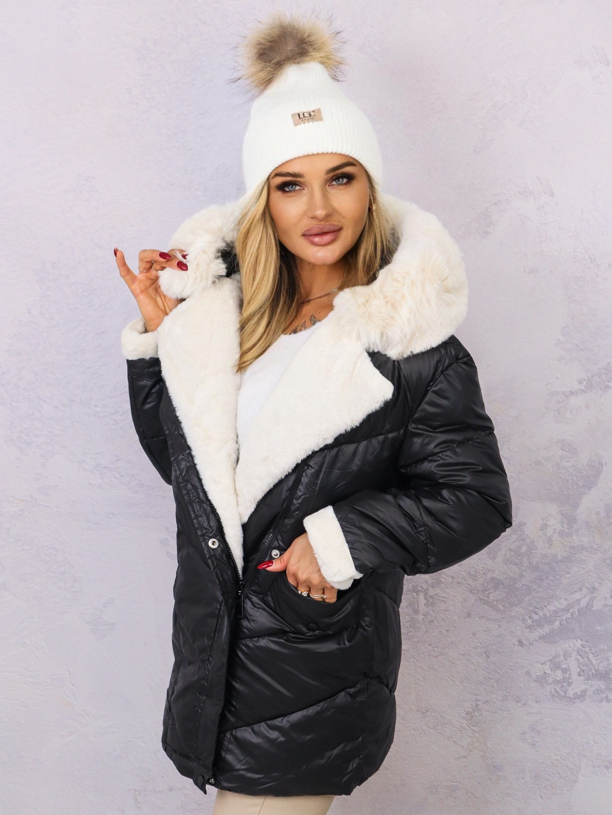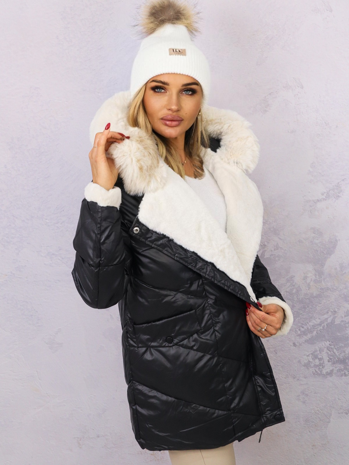 KURTKA PIKOWANA PUCHOWA Z FUTERKIEM NA RĘKAWACH- CZARNA