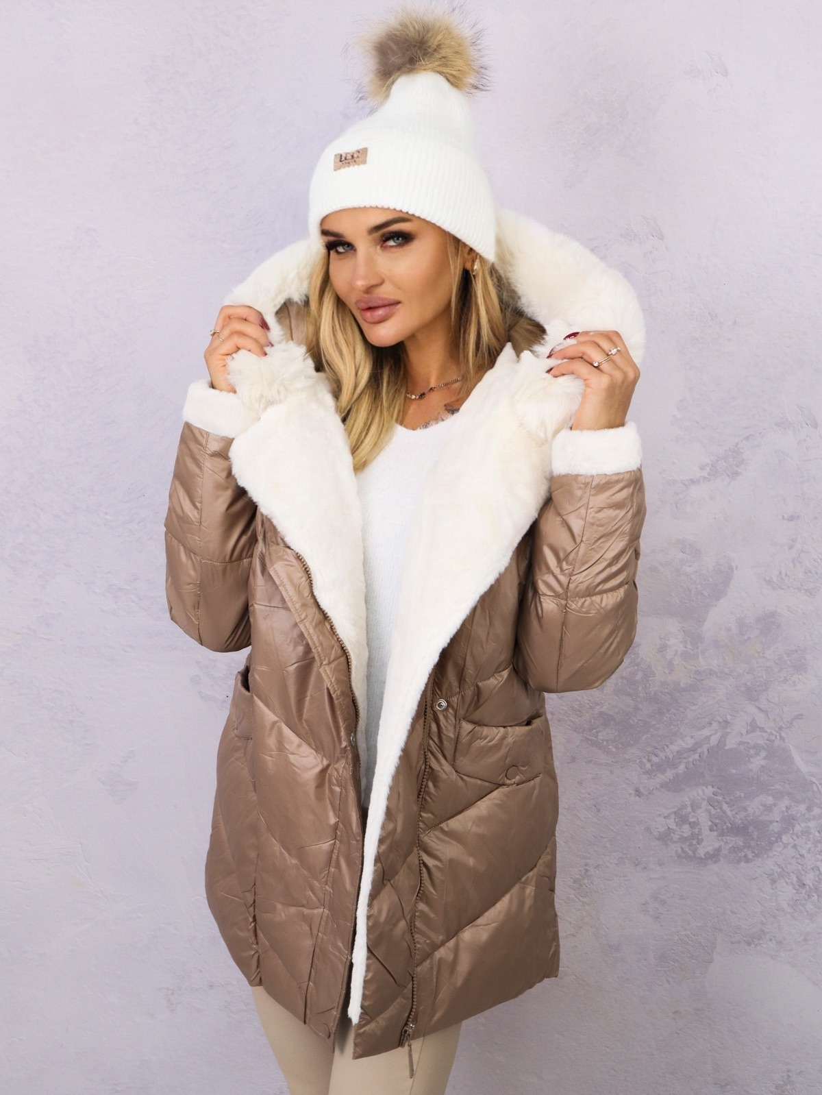 KURTKA PIKOWANA PUCHOWA Z FUTERKIEM NA RĘKAWACH- BRĄZOWA