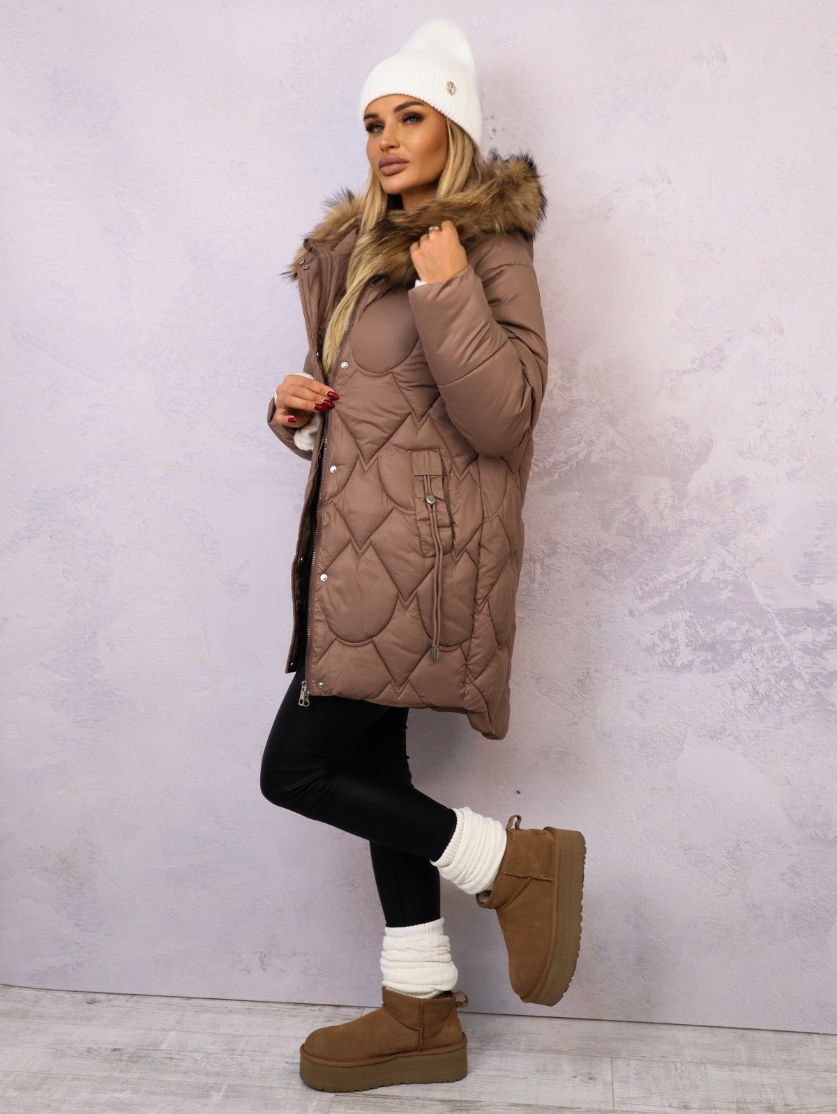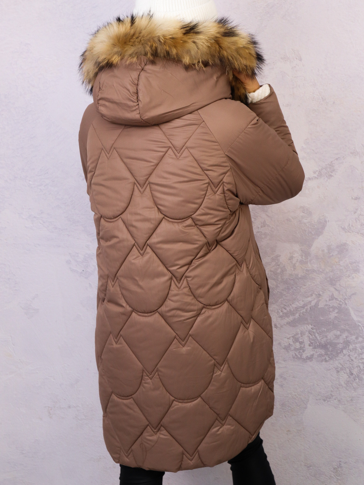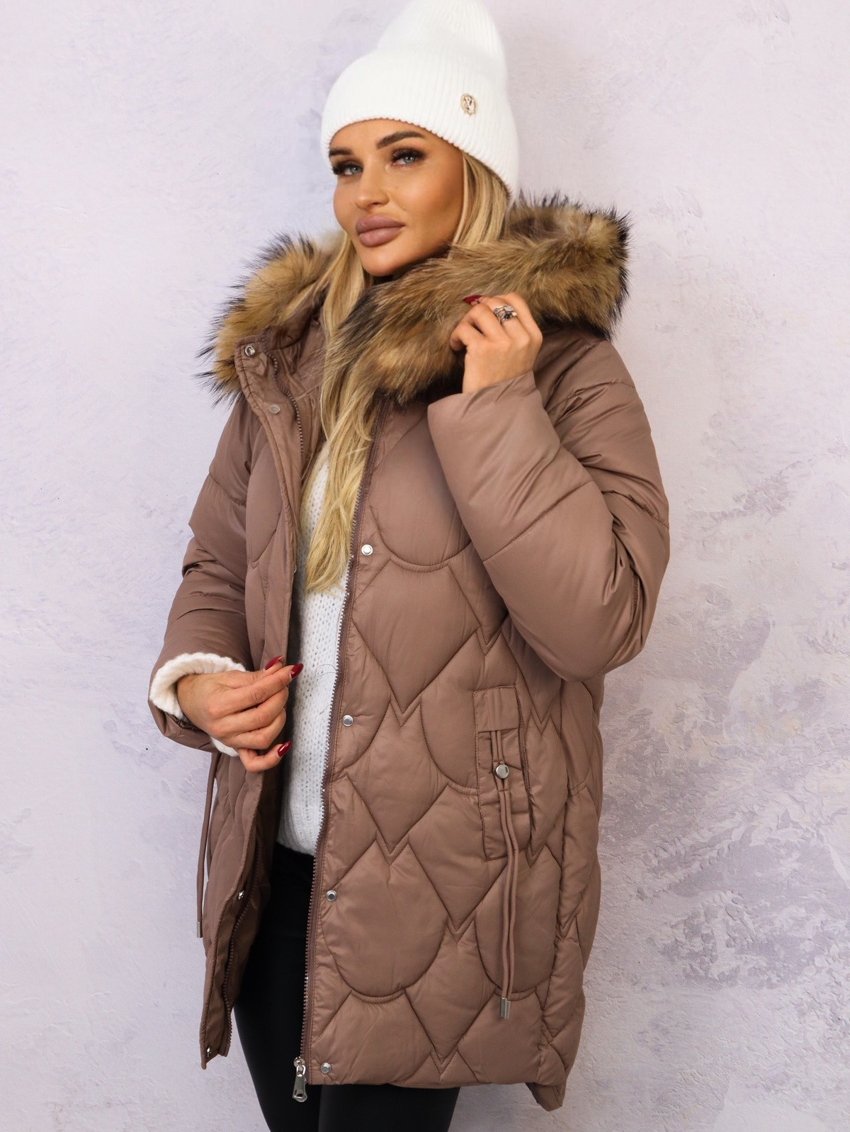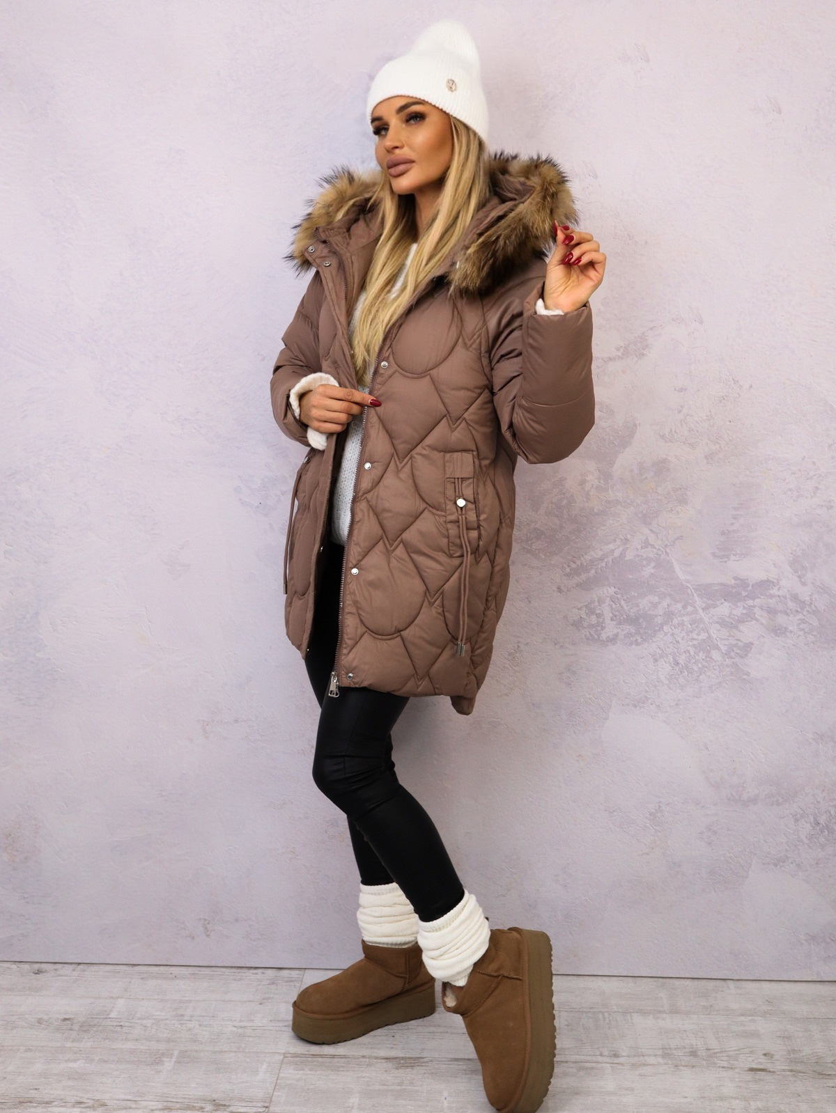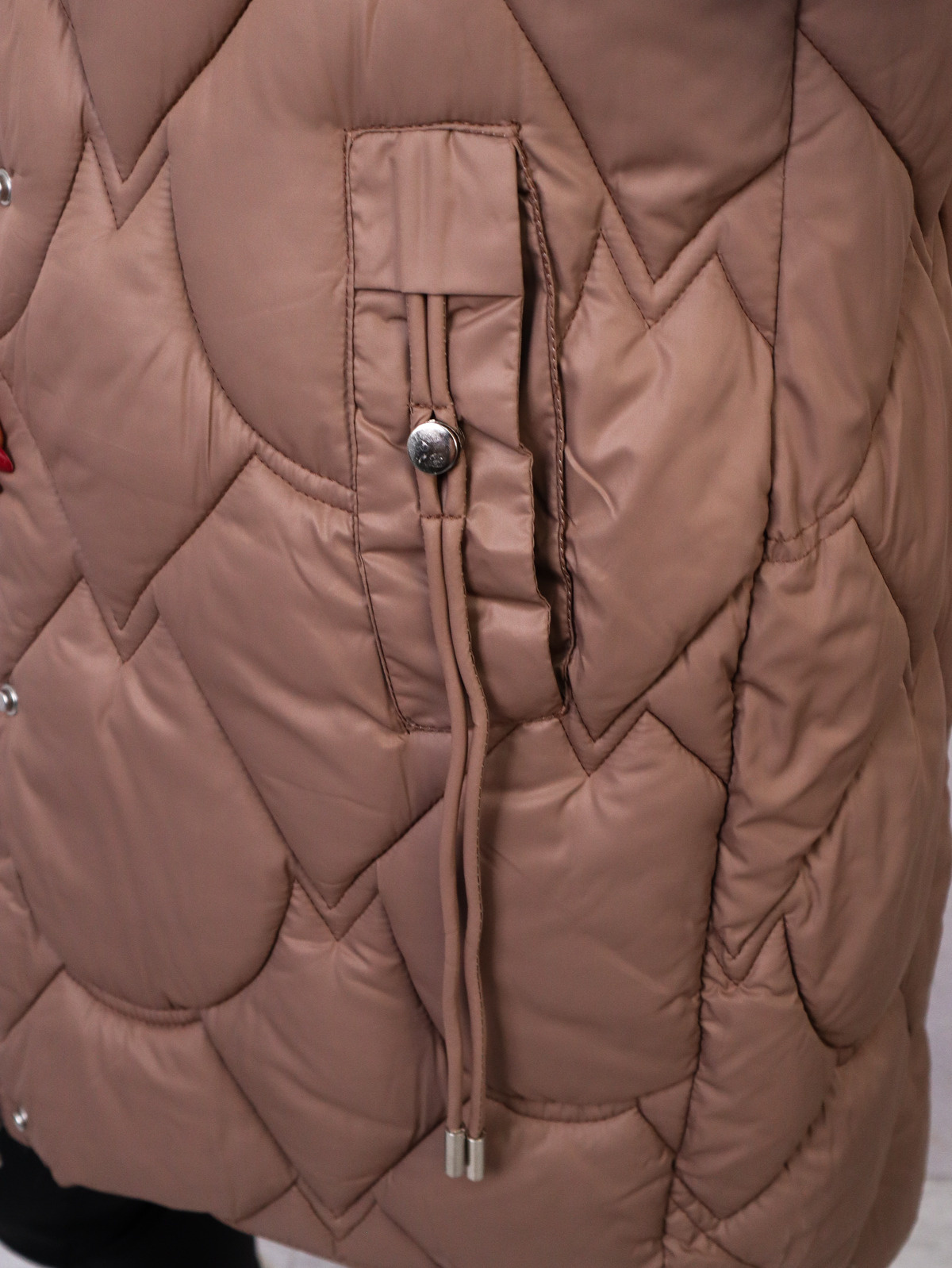 ASYMETRYCZNA PIKOWANA KURTKA Z KAPTUREM- BRĄZOWA