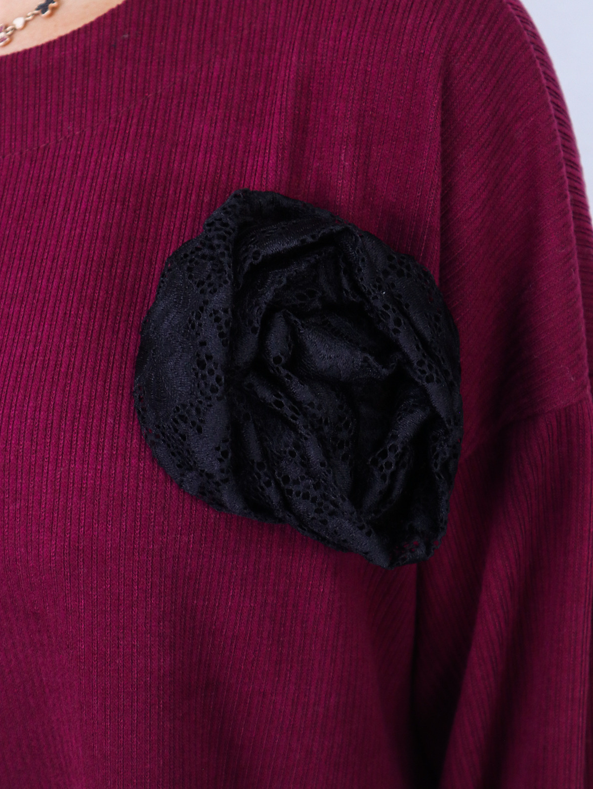 DZIANINOWA PRĄŻKOWANA SUKIENKA Z OZDOBNYM KWIATEM I KORONKĄ- BORDOWA