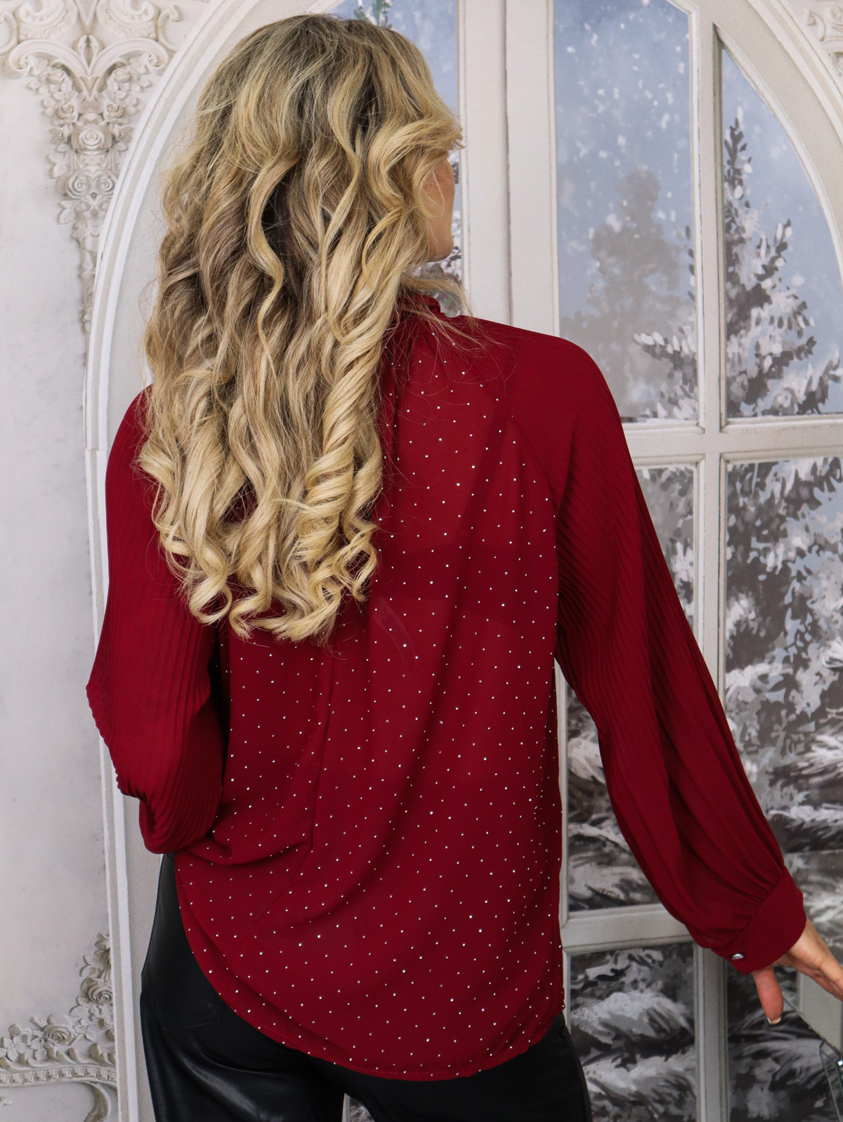 TIULOWA BLUZKA Z PLISOWANYMI RĘKAWAMI ZDOBIONA CYRKONIAMI- BORDOWA