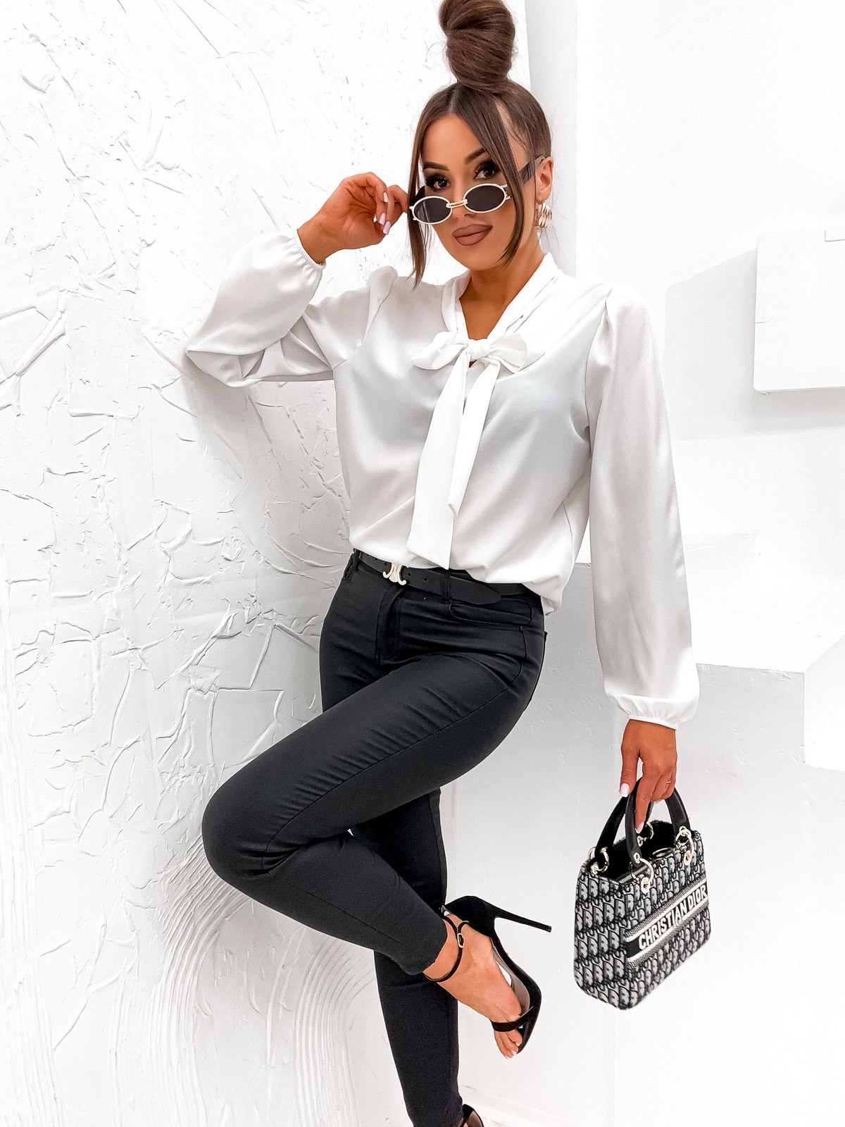 BLUZKA Z OZDOBNYM WIĄZANIEM PRZY SZYI- BIAŁA
