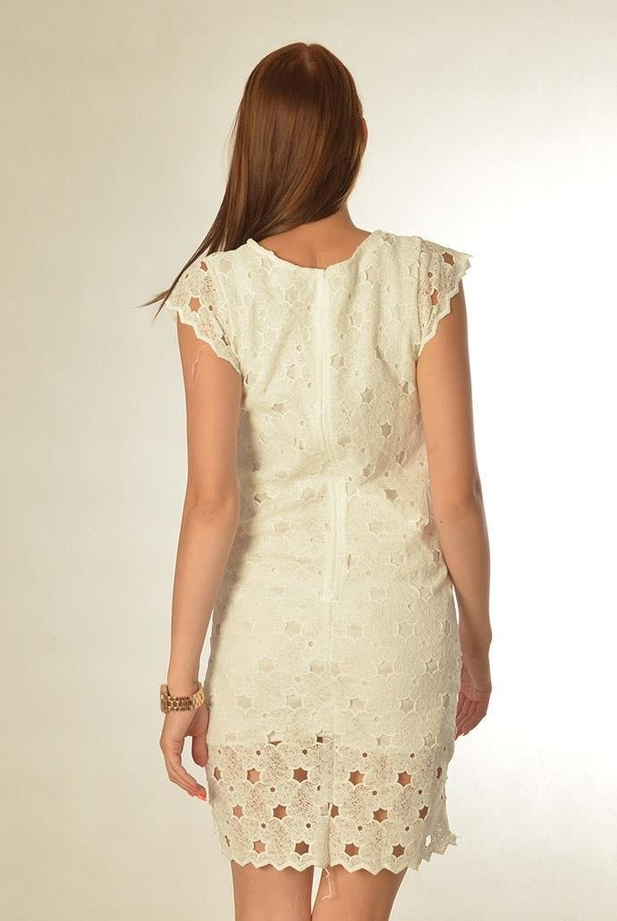 Koronkowa sukienka z krótkim rękawem. Zapinana na zamek na plecach.
