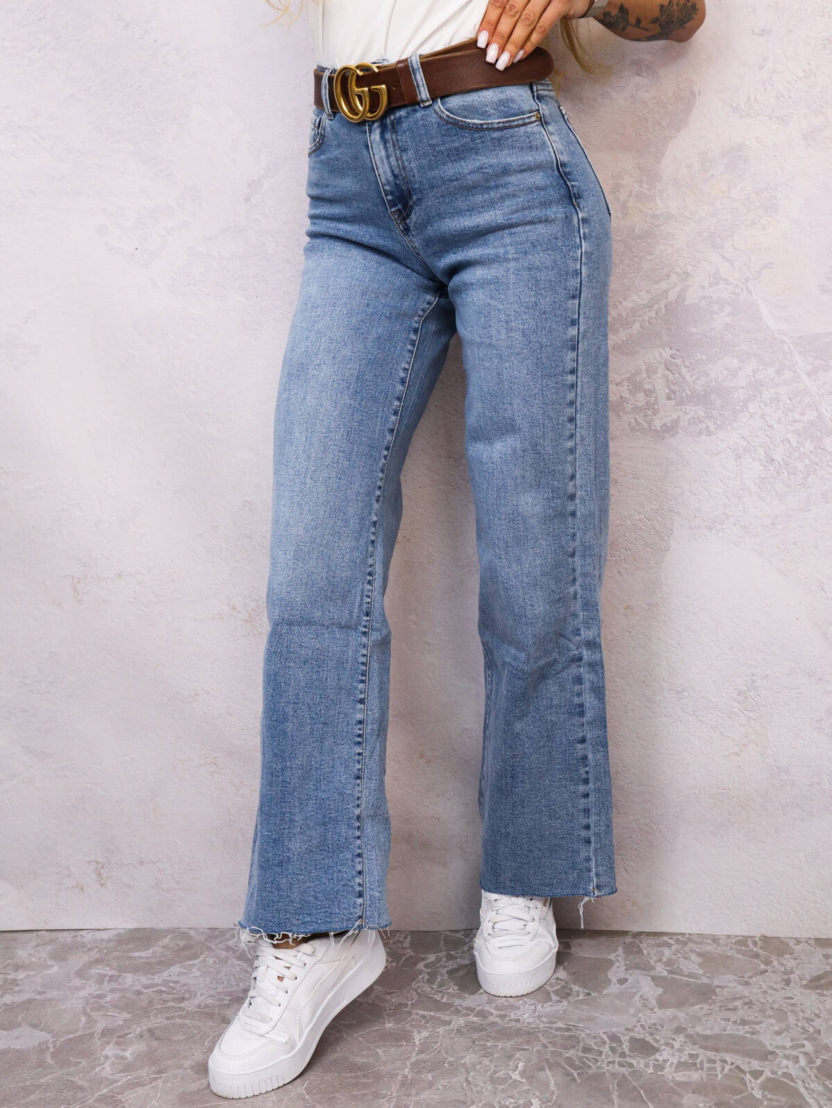 Spodnie jeansowe z szerokimi nogawkami. Surowo wykończone, kieszenie z przodu i z tyłu. Elastyczny, komfortowy jeans.