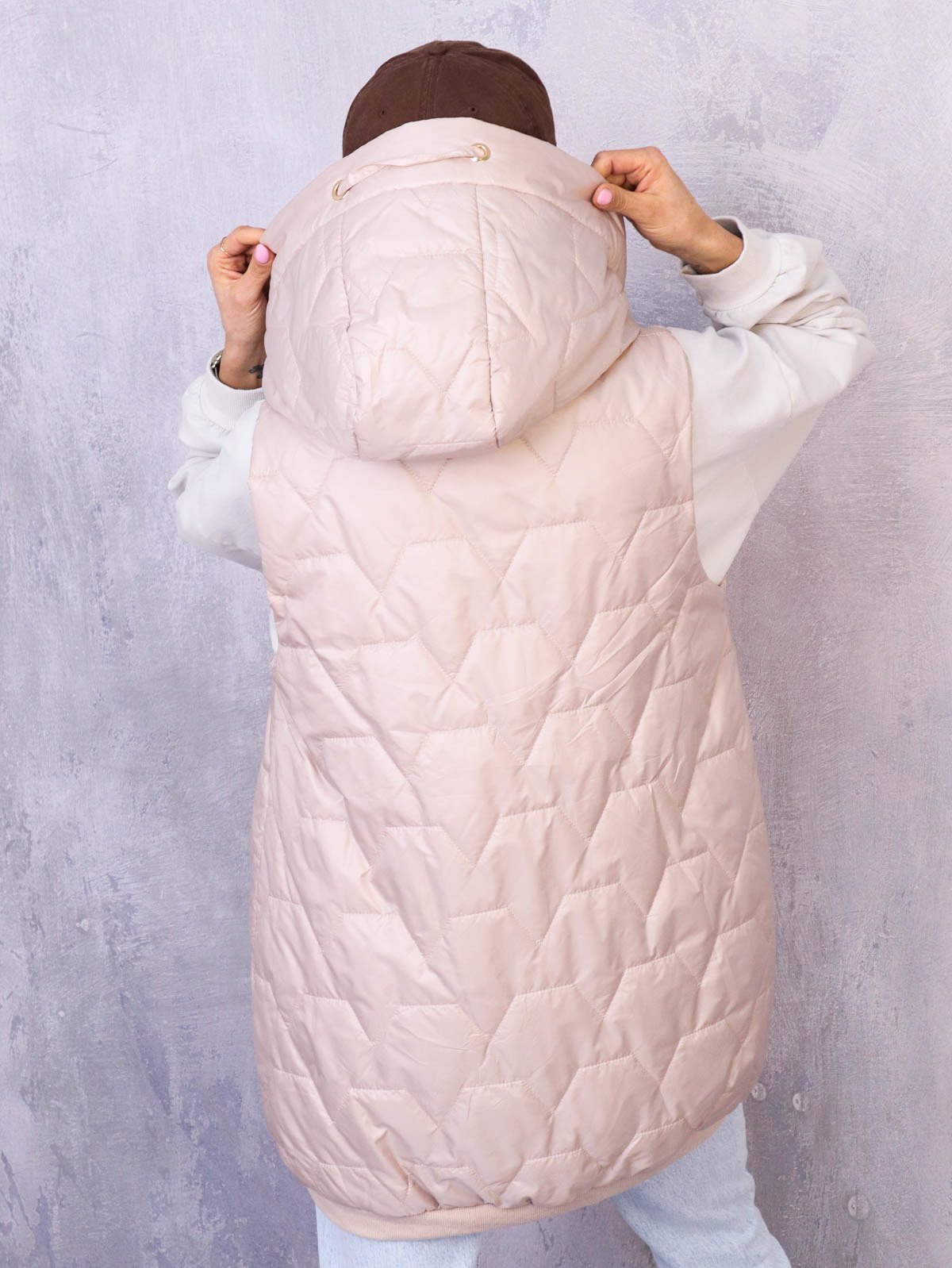 Asymetryczna kamizelka z ozdobną naszywką i ozdobnymi taśmami przy kapturze i kieszeniach. Kontrastowy kaptur.