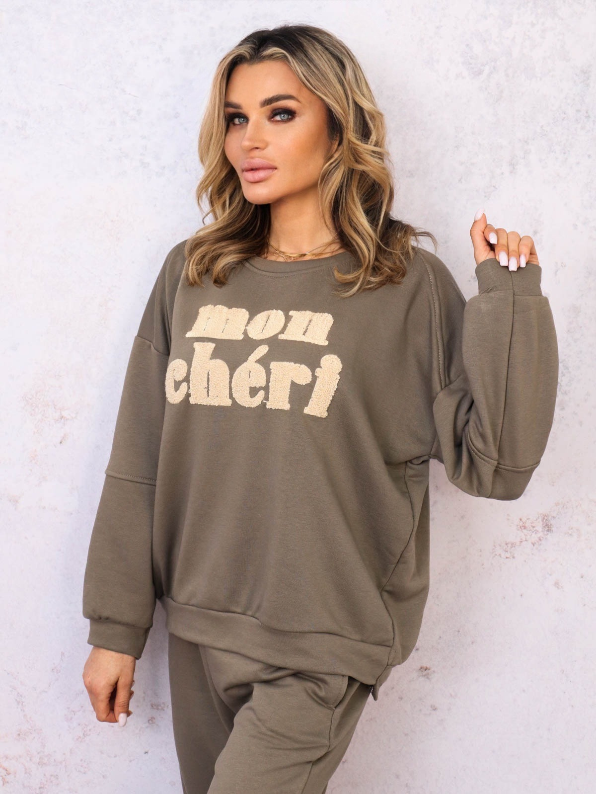 Komplet dresowy bluza+ spodnie. Bluza z wyszywanym napisem i ozdobnymi przeszyciami na rękawach. Spodnie z gumą w pasie zakończone ściągaczem.