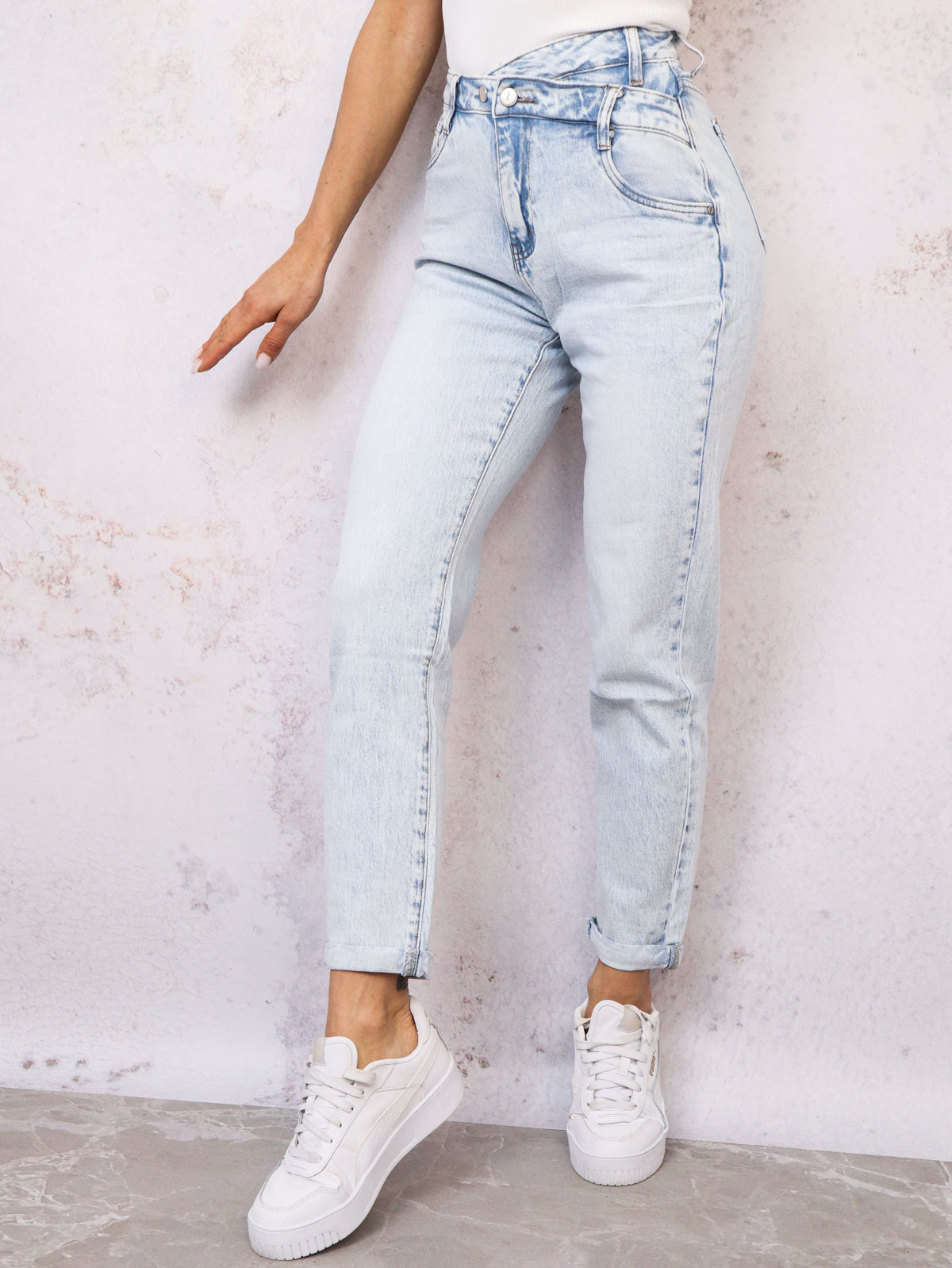 SPODNIE JEANSOWE MOM FIT Z ASYMETRYCZNYM PASEM- JASNY JEANS