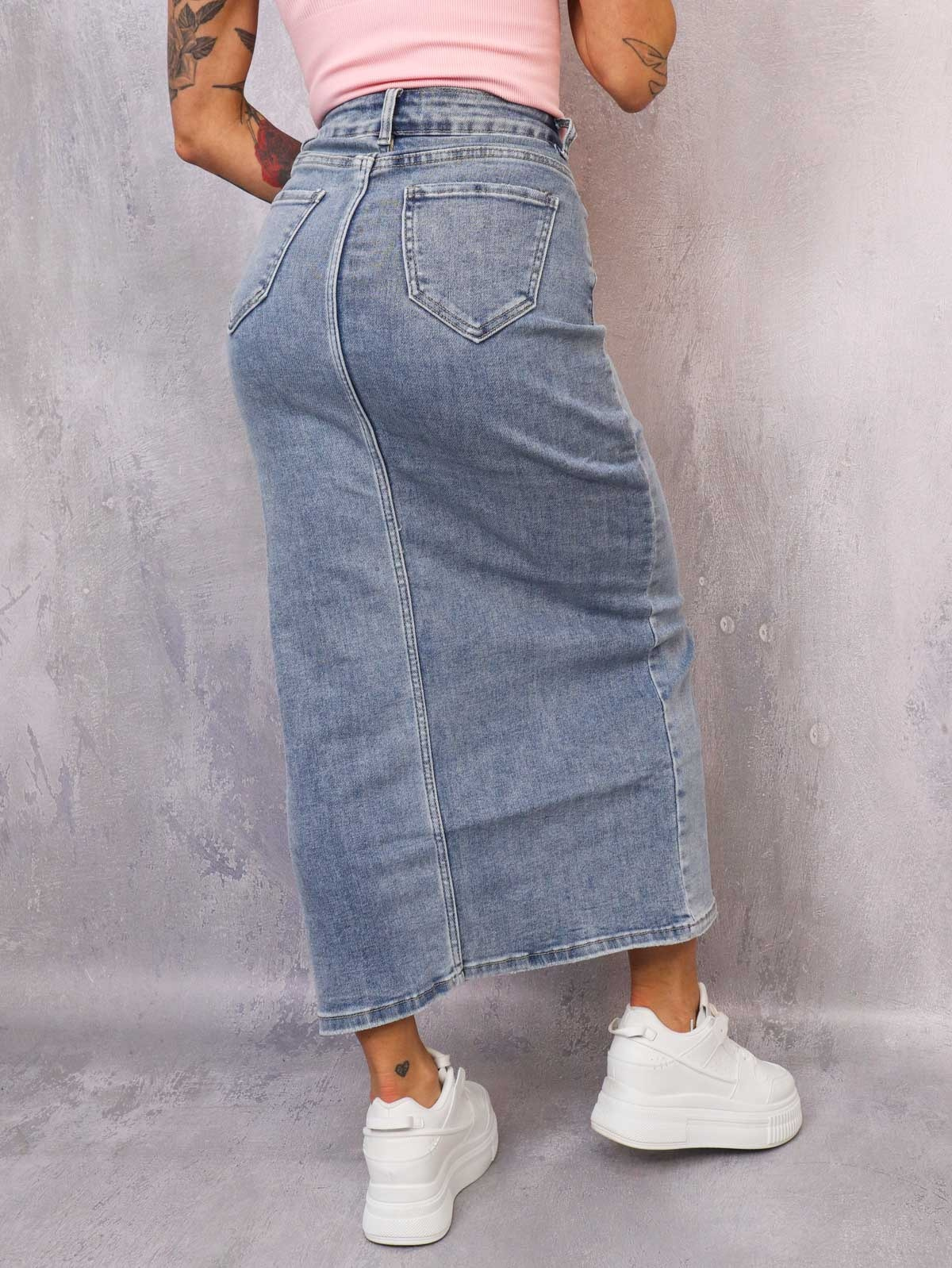 Spódnica midi jeansowa o prostym kroju z rozcięciem z przodu, wysokim stanem, kieszeniami i zapięciem na suwak i guzik. Z elastycznej i komfortowej tkaniny.