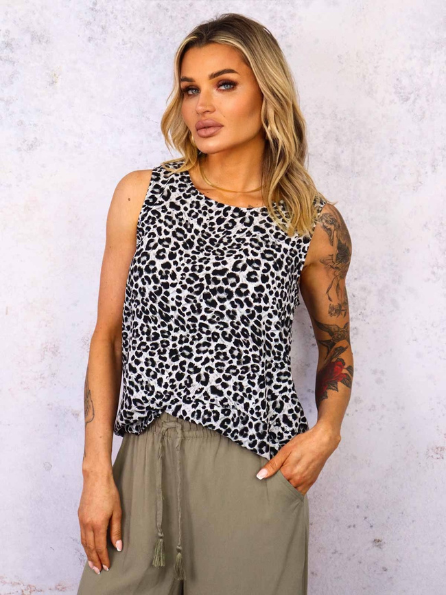 Top na ramiączkach w panterkowy wzór. Ozdobne przeszycie na dole.