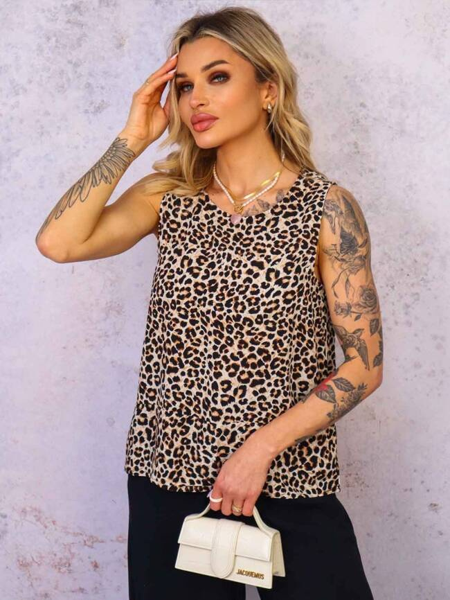 Top na ramiączkach w panterkowy wzór. Ozdobne przeszycie na dole.