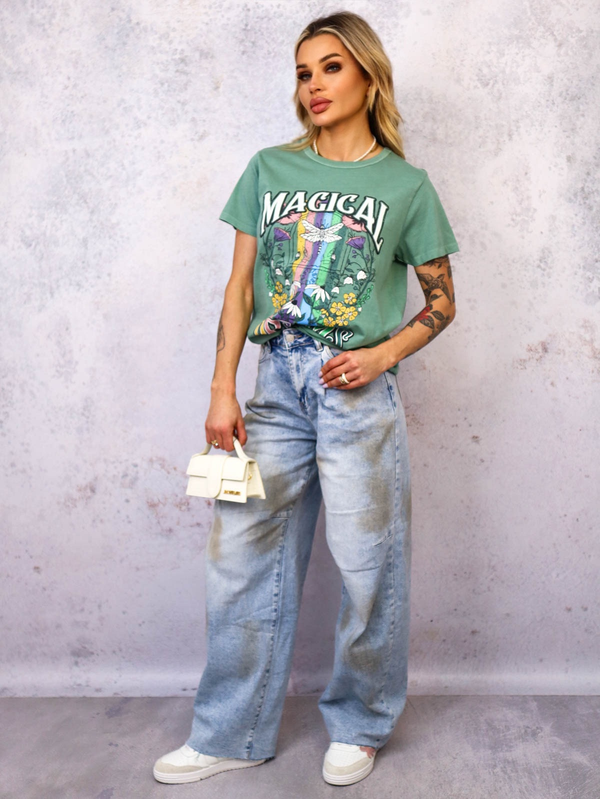 ZIELONY DEKATYZOWANY T-SHIRT Z KOLOROWYM PRINTEM
