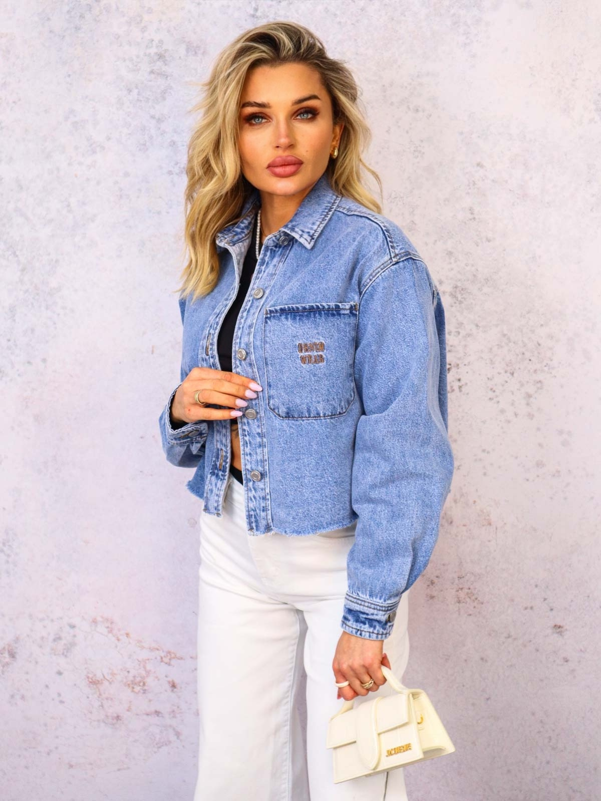 Krótka kurtka jeansowa z surowym zakończeniem. Haftowany napis na kieszeni z przodu.