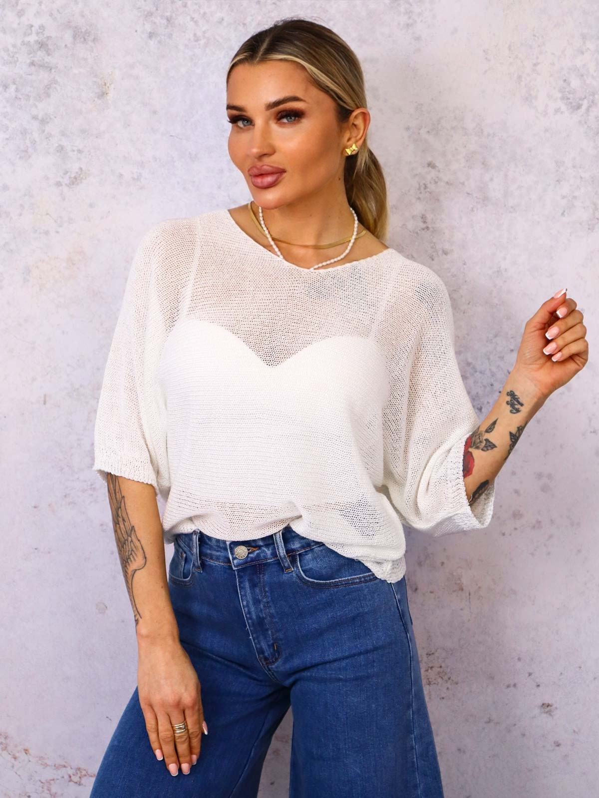 SWETER O KROJU NIETOPERZA Z OZDOBNYMI GUZIKAMI- BIAŁY