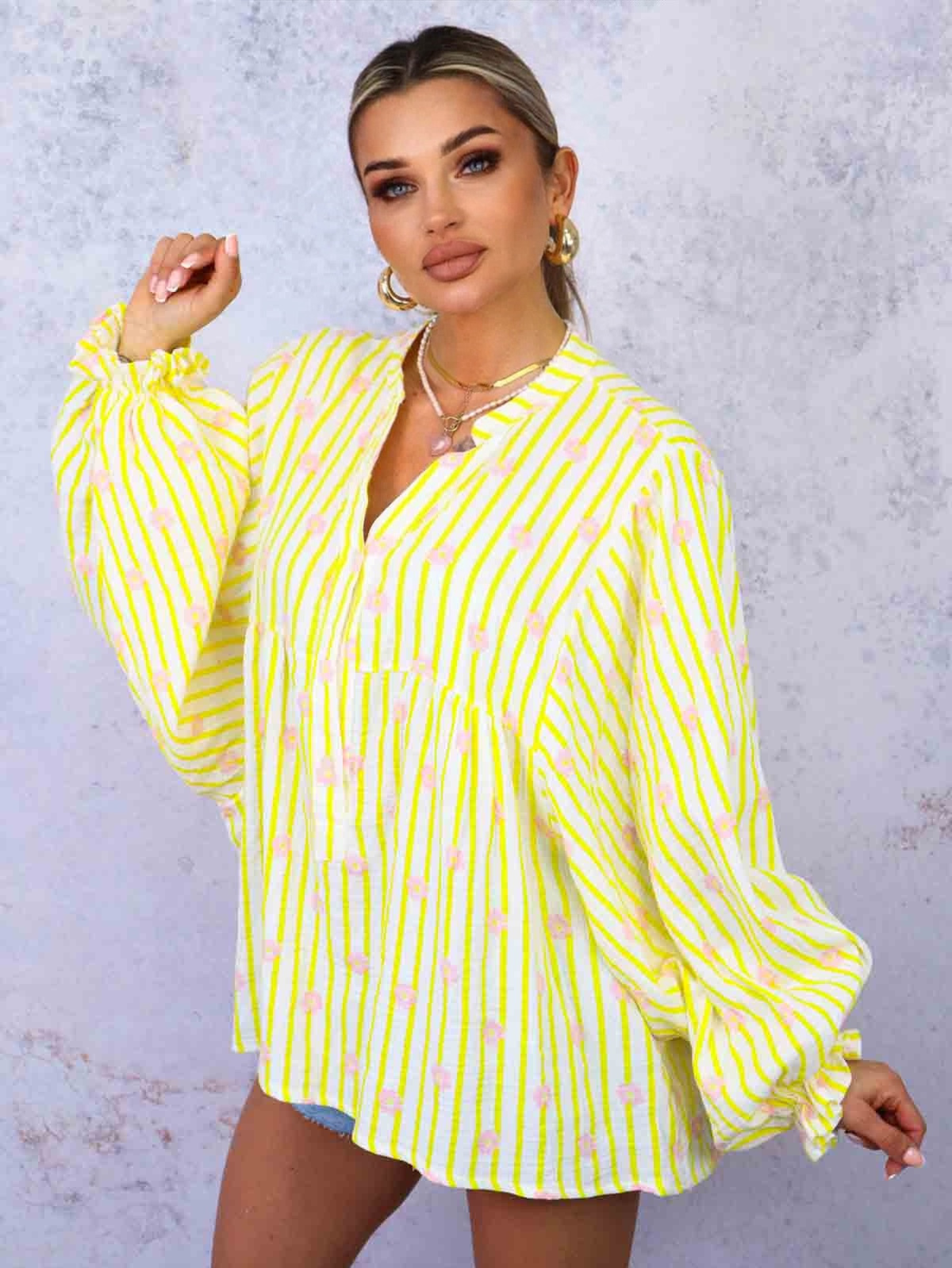 BLUZKA KOSZULOWA OVERSIZE W PASKI I KWIATY- ŻÓŁTA