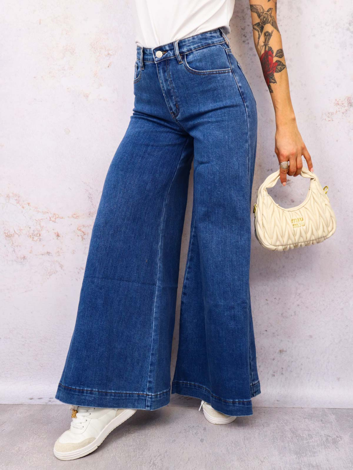 Spodnie jeansowe z bardzo szeroką nogawką i wysokim stanem. Przyjemny i elastyczny materiał.