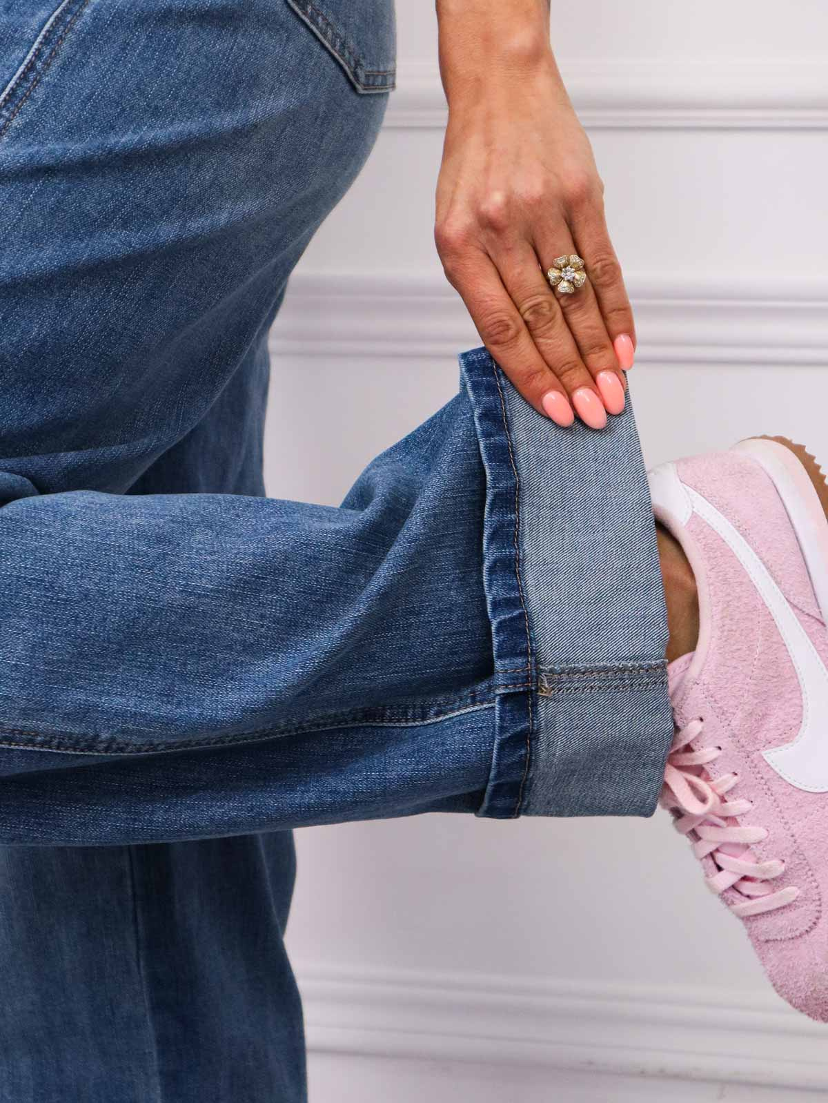 Spodnie jeansowe z asymetrycznym zapięciem. Podwinięte nogawki, przyjemny i elastyczny materiał.