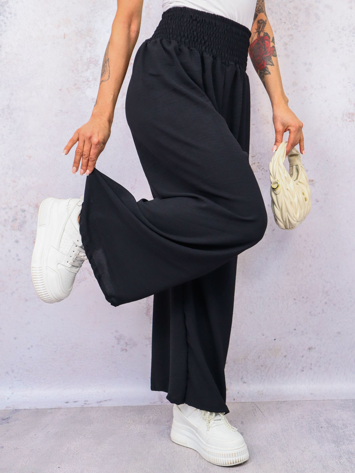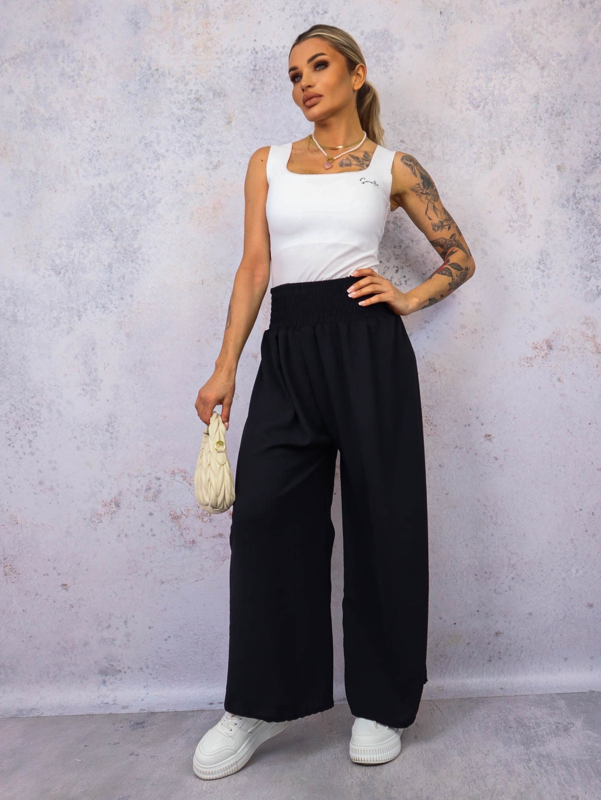 SPODNIE MATERIAŁOWE Z SZEROKIMI NOGAWKAMI I GUMĄ W PASIE- CZARNE