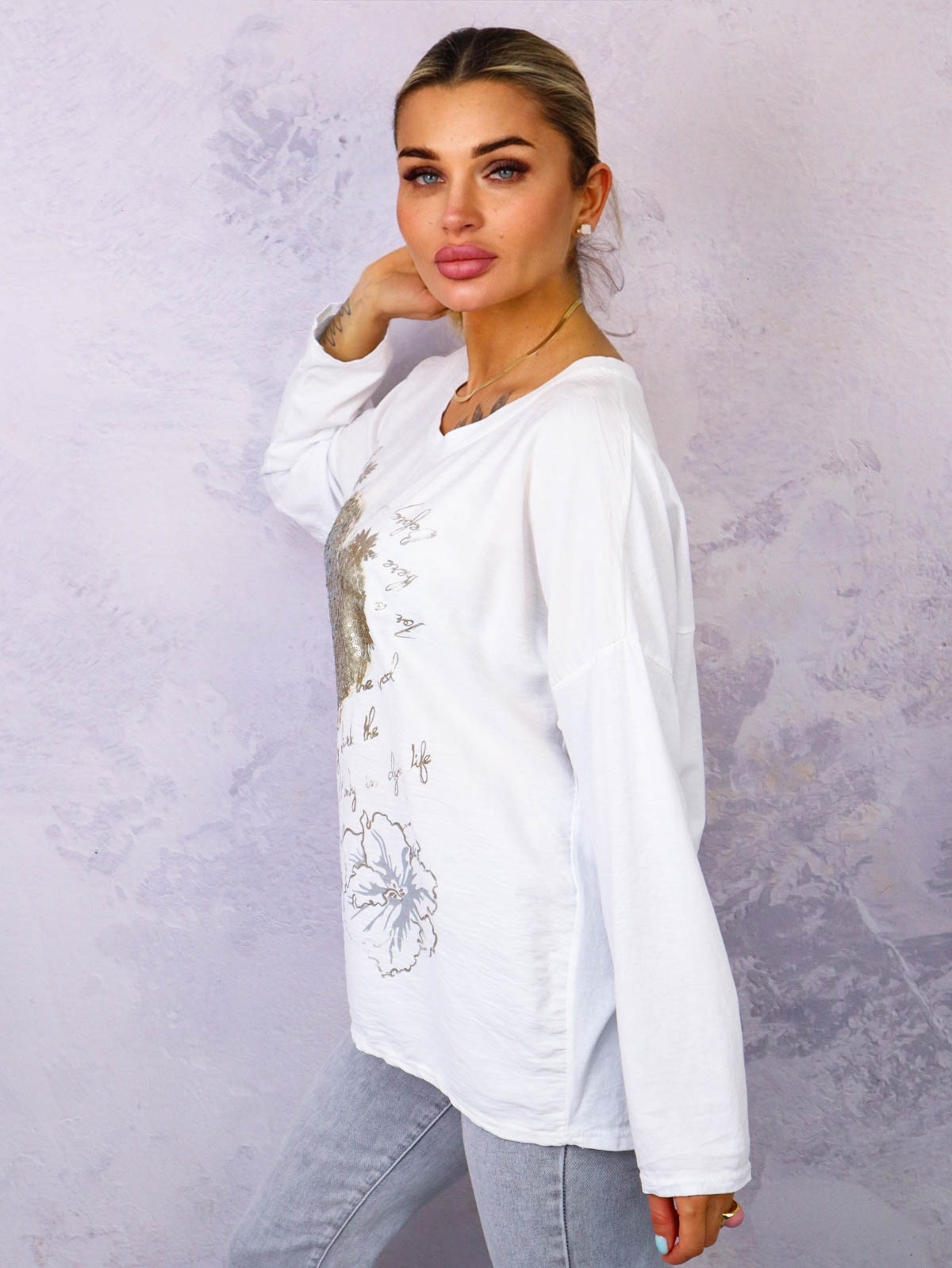 BLUZKA Z APLIKACJĄ I OZDOBNYMI CEKINAMI- BIAŁA