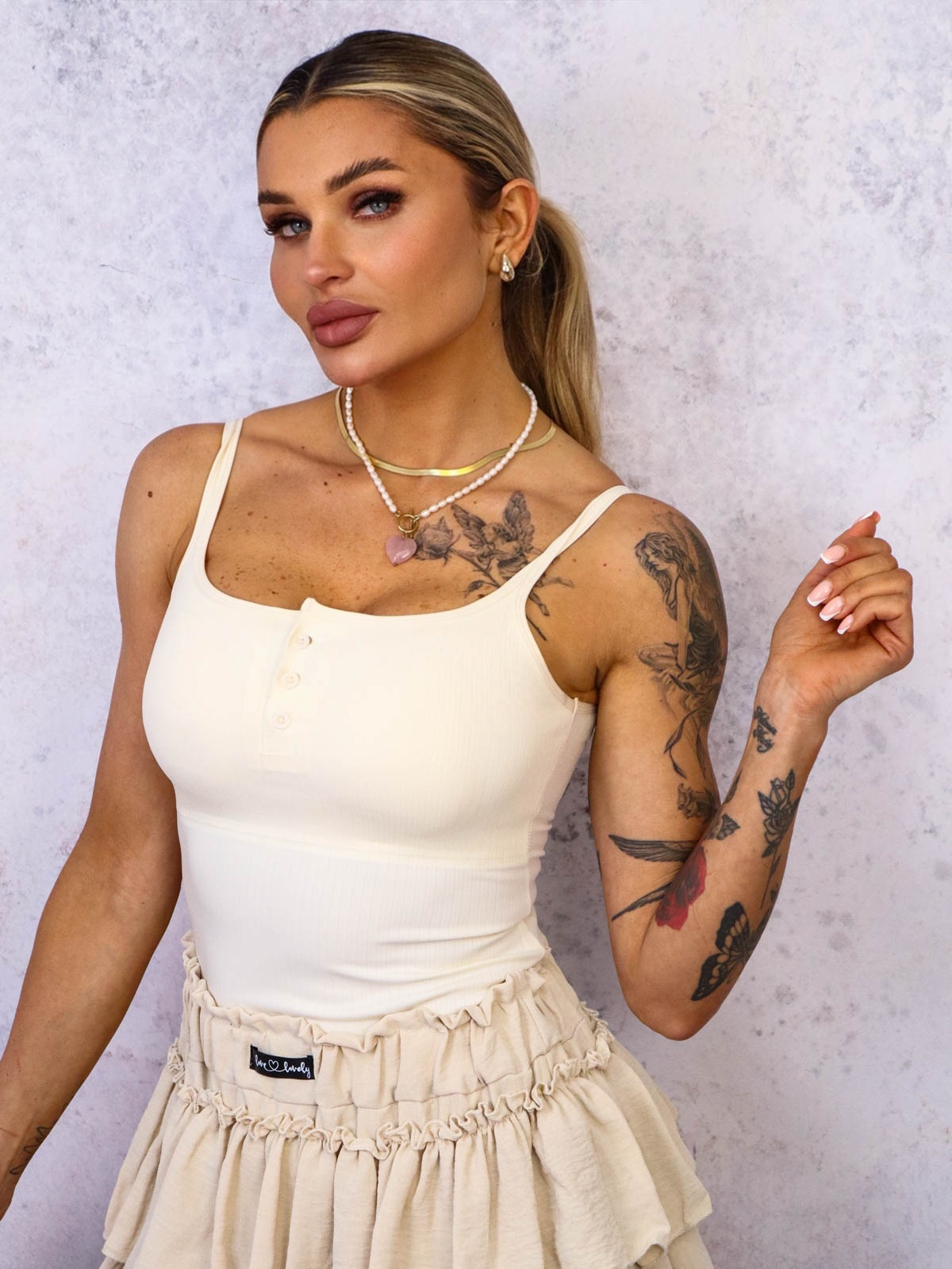 USZTYWNIANY TOP NA RAMIĄCZKA Z GUZIKAMI- ECRU