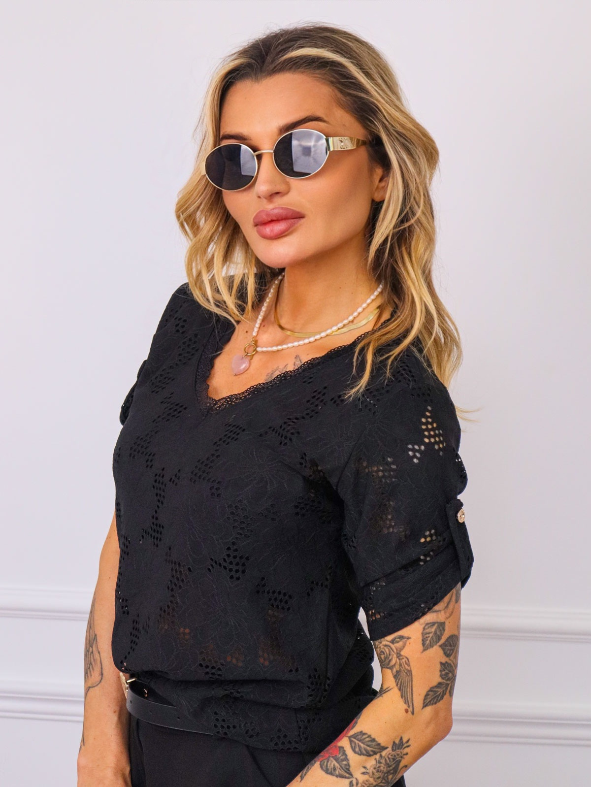 AŻUROWA BLUZKA Z KORONKĄ PRZY DEKOLCIE- CZARNA