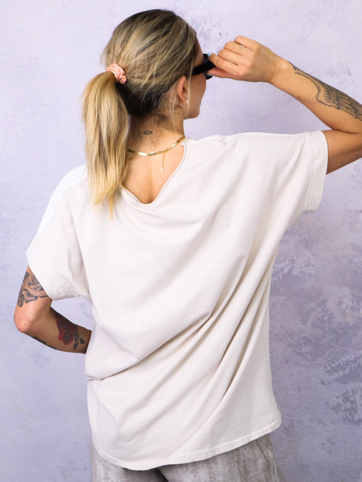 Bluzka oversize z ozdobnymi złotymi kwiatami. Dół i dekolt surowo zakończony.
