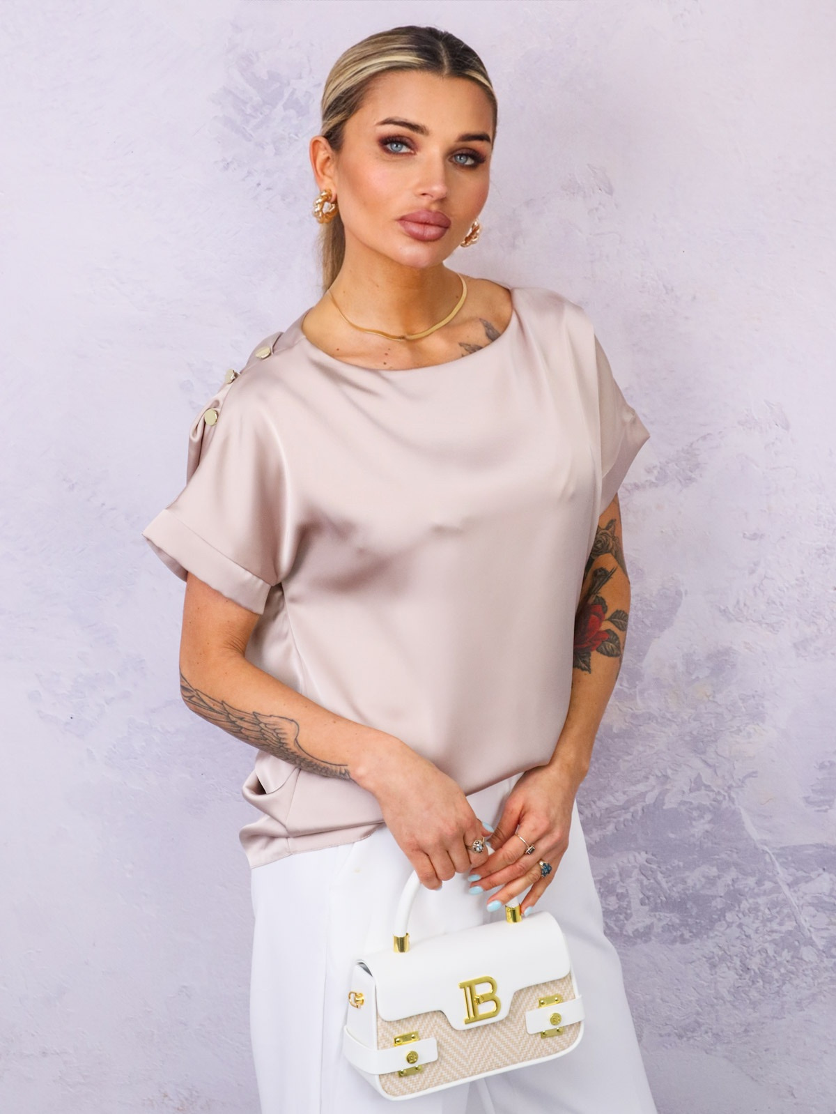 SATYNOWA BLUZKA Z OZDOBNYMI GUZIKAMI NA RAMIENIU- BEŻOWA