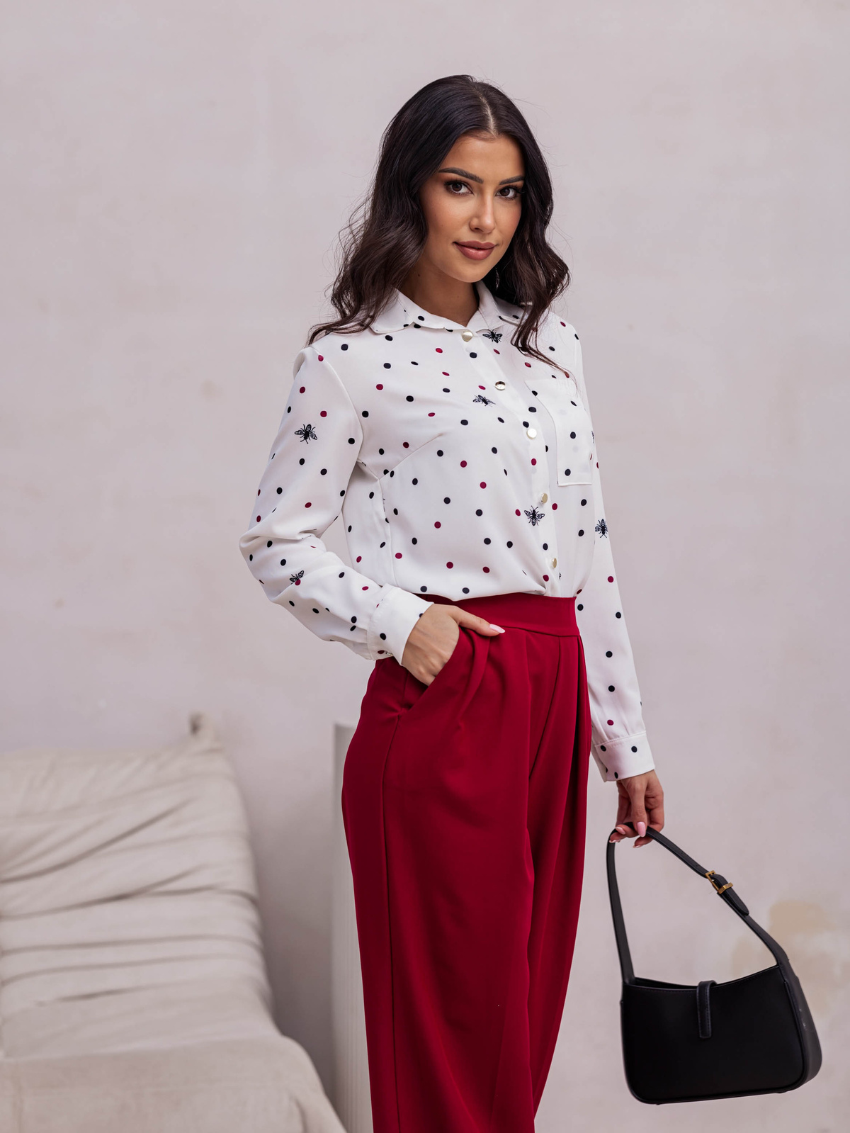 WZORZYSTA KOSZULA ZAPINANA NA GUZIKI- BIAŁA W BORDOWE KROPKI