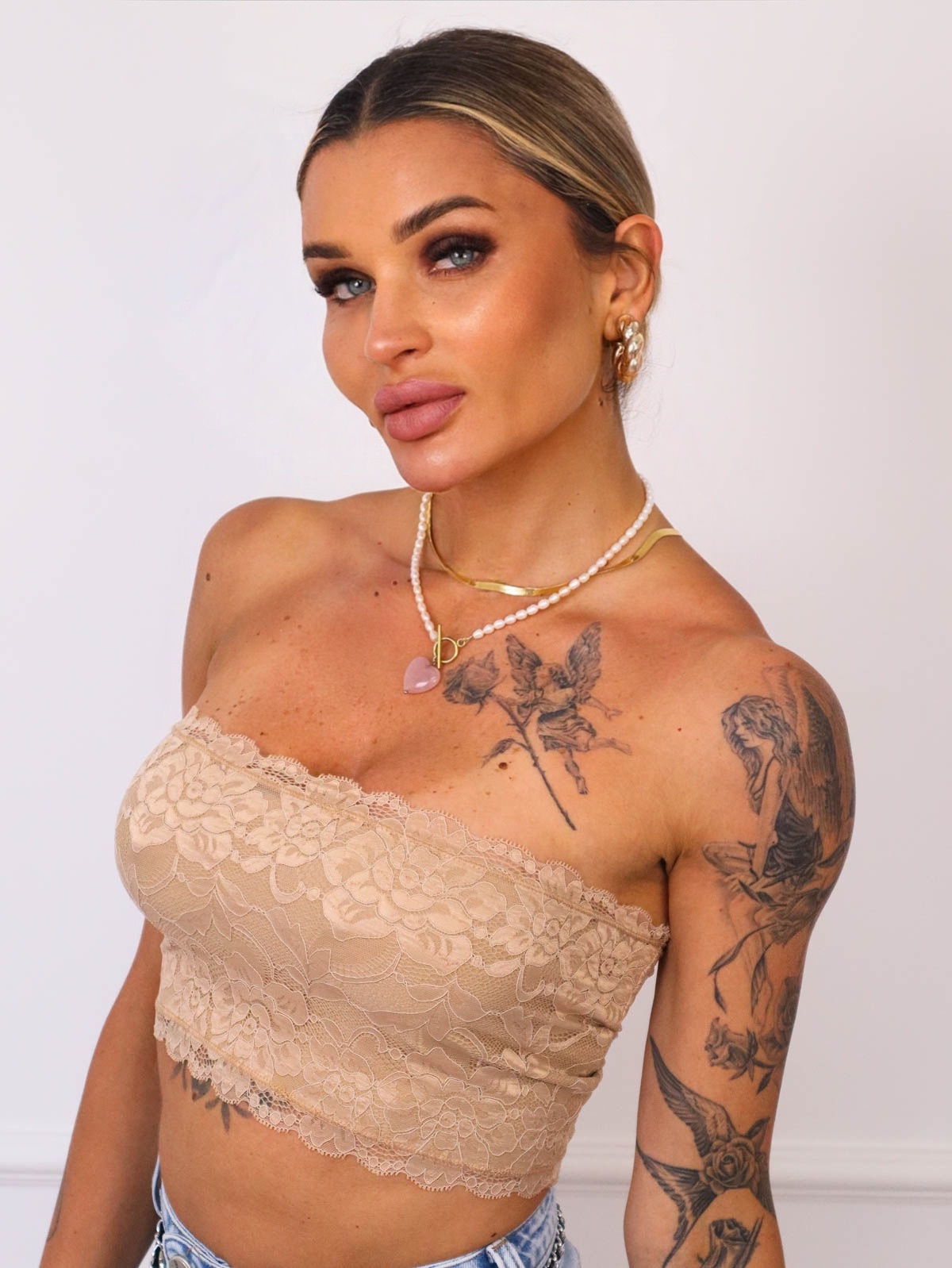 TOP KORONKOWY BANDEAU BEZ RAMIĄCZEK- BEŻOWY