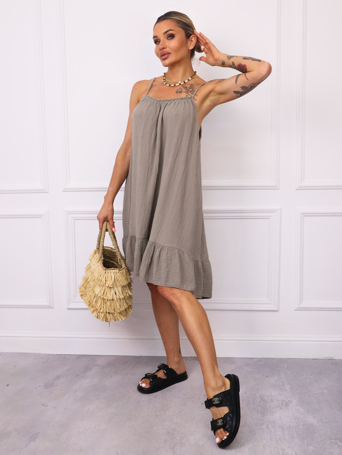 Sukienka mini wykonana z wysokiej jakości muślinowego materiału. Falbana na dole.