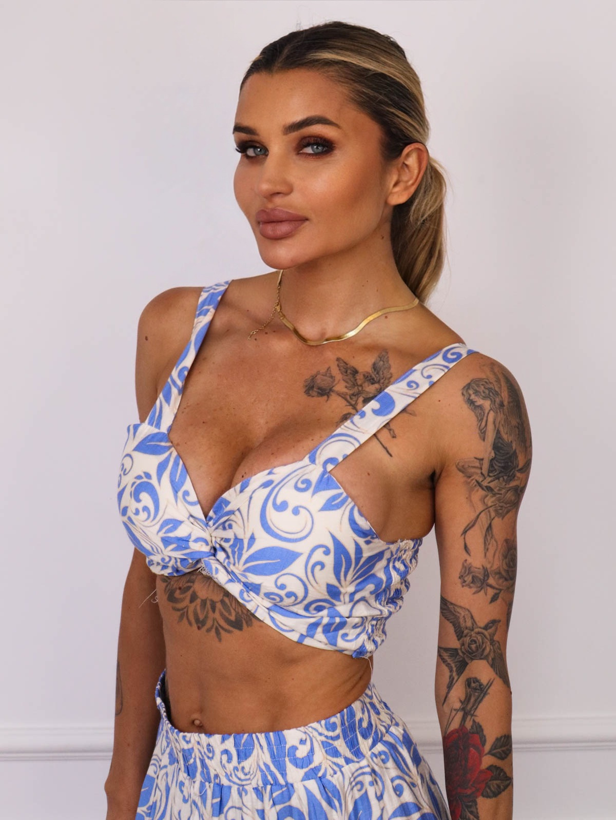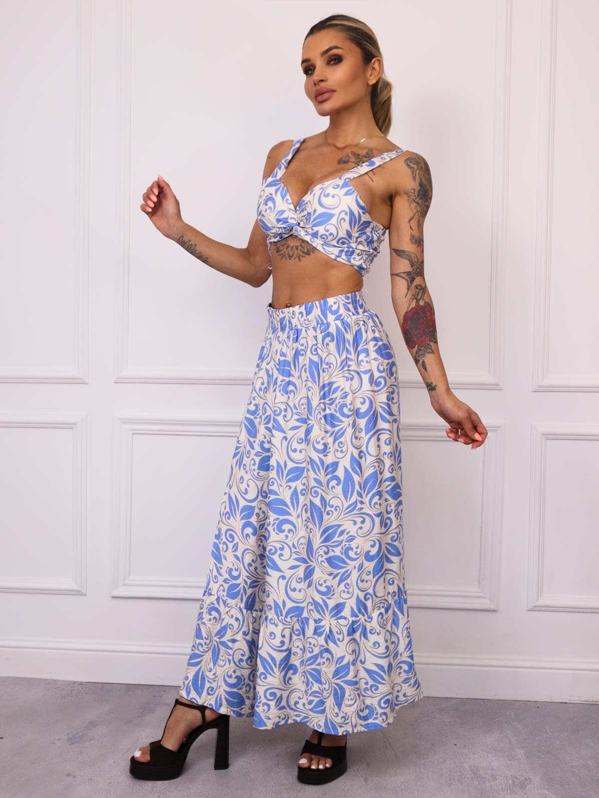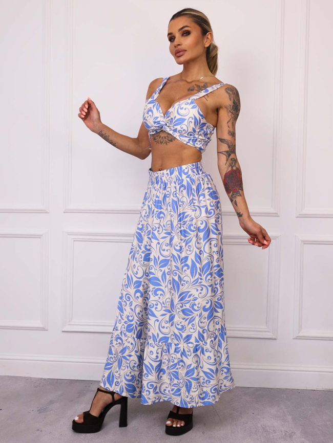 KOMPLET WZORZYSTY TOP+ SPÓDNICA Z ROZCIĘCIEM- NIEBIESKI