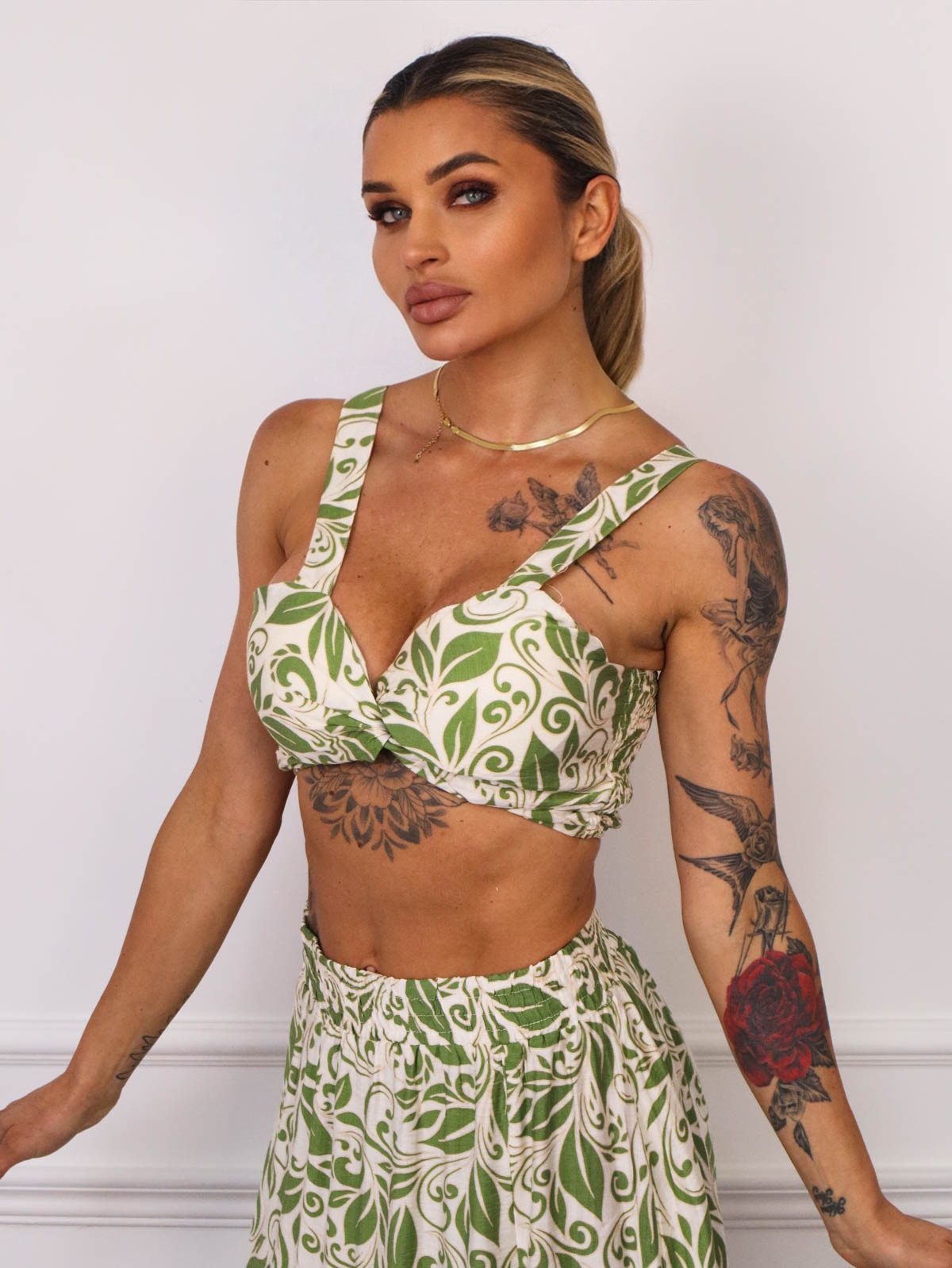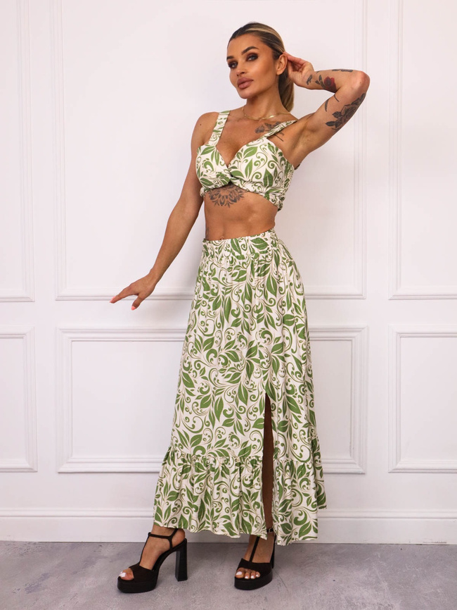 KOMPLET WZORZYSTY TOP+ SPÓDNICA Z ROZCIĘCIEM- ZIELONY