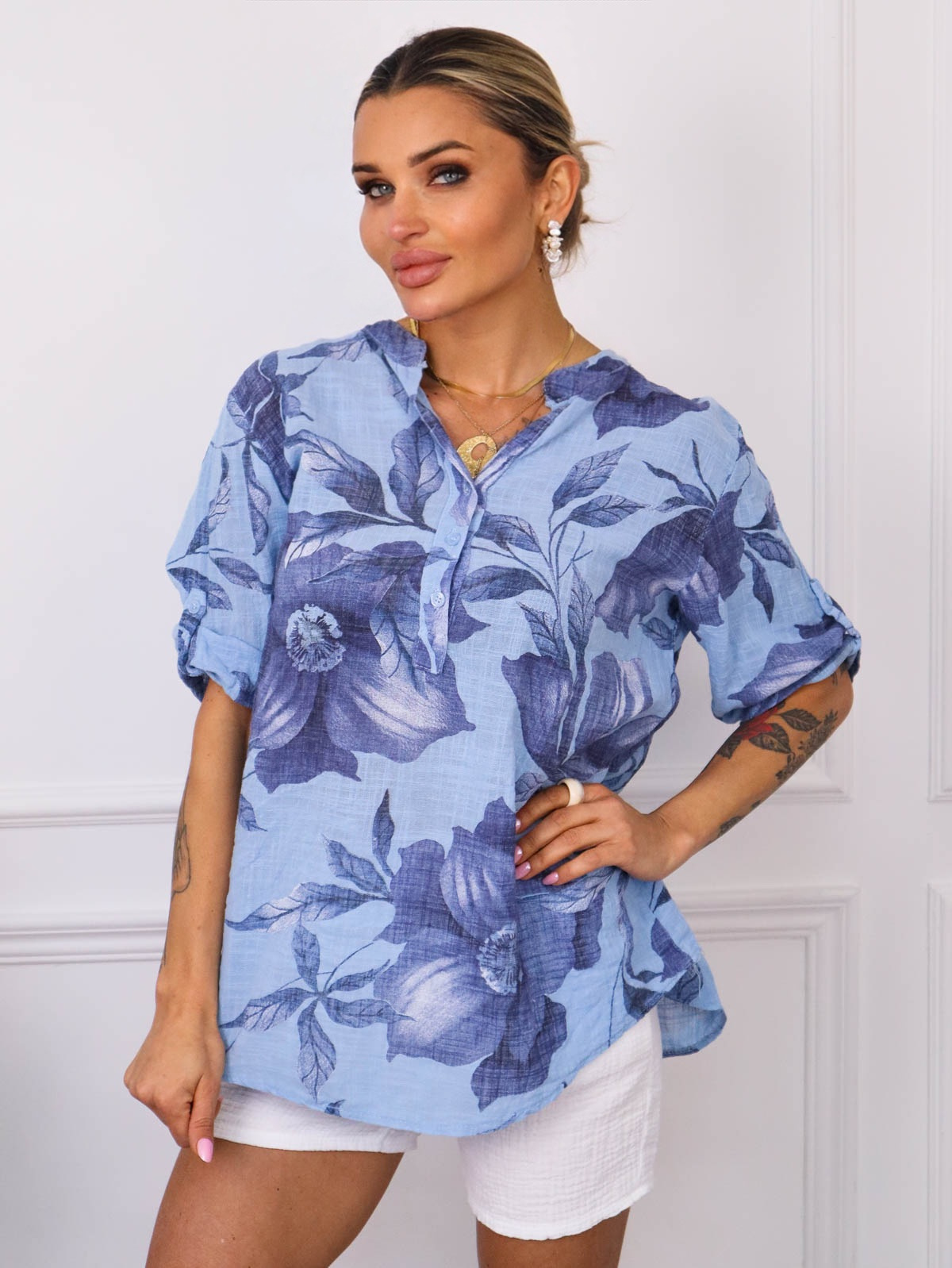 KOSZULA WZORZYSTA Z LNEM- NIEBIESKA