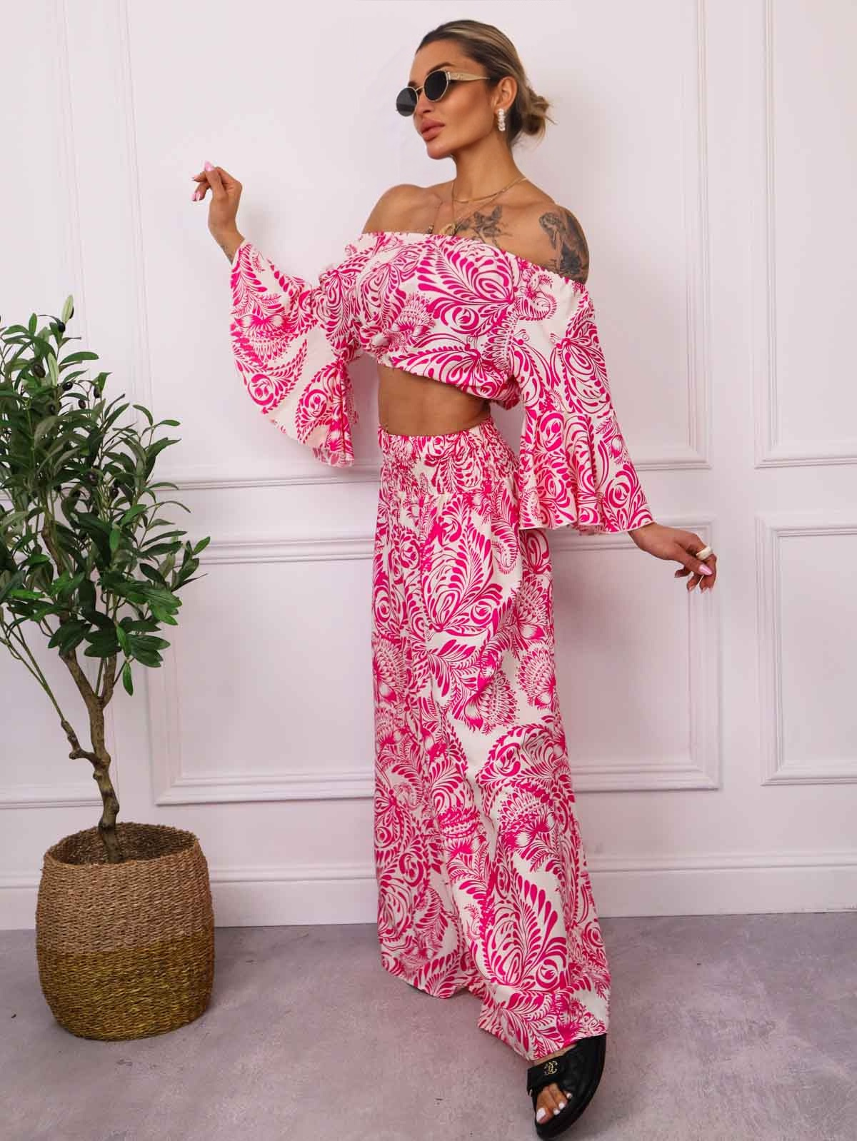 KOMPLET WZORZYSTY TOP+ SPODNIE- FUKSJA