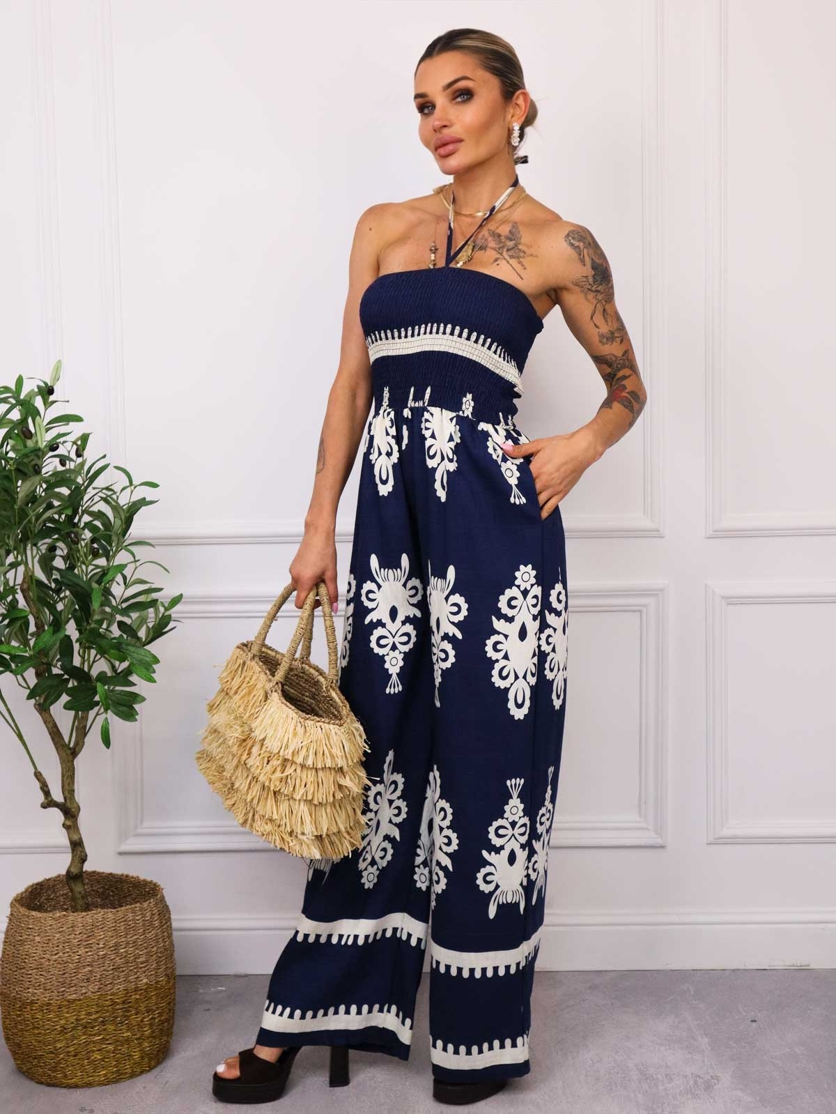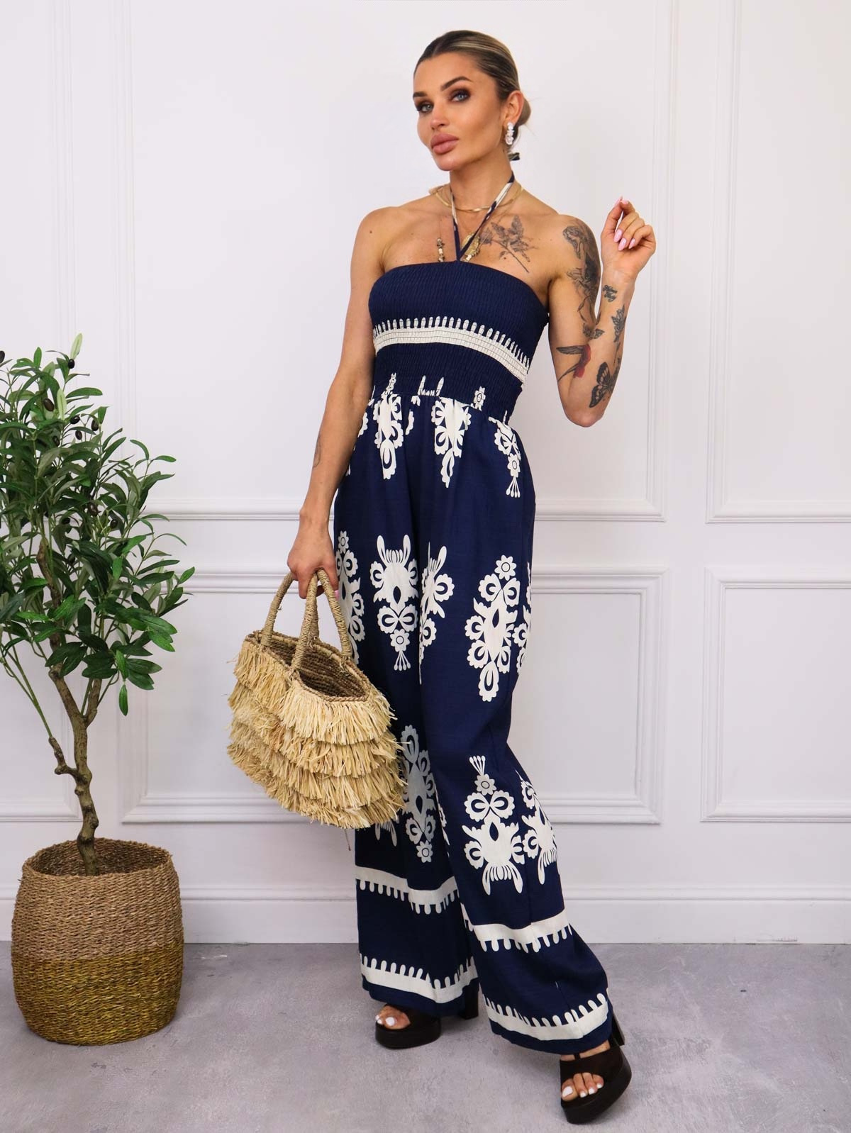 KOMBINEZON WZORZYSTY BEZ RAMIĄCZEK- GRANATOWY