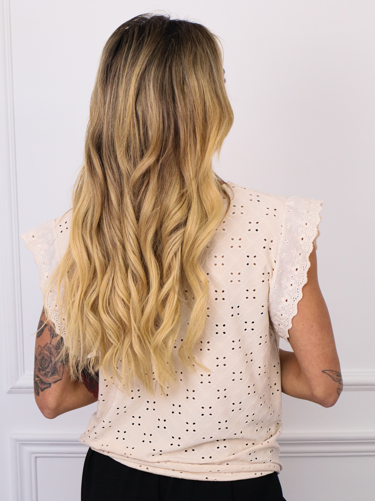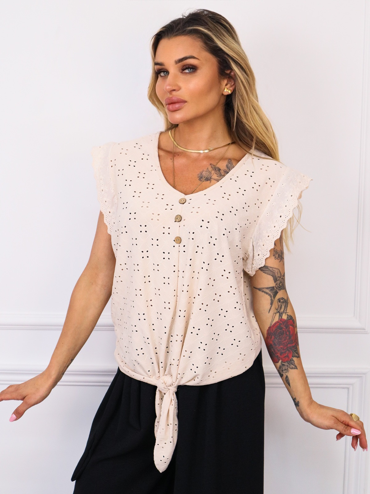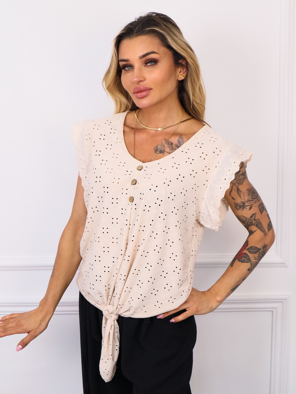 BLUZKA AŻUROWA Z WIĄZANIEM I GUZIKAMI- BEŻOWA