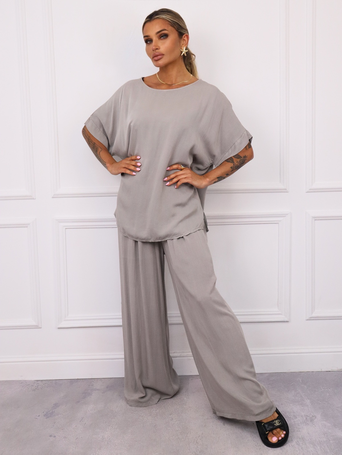 KOMPLET T-SHIRT OVERSIZE+ SPODNIE Z GUMĄ W PASIE- SZARY